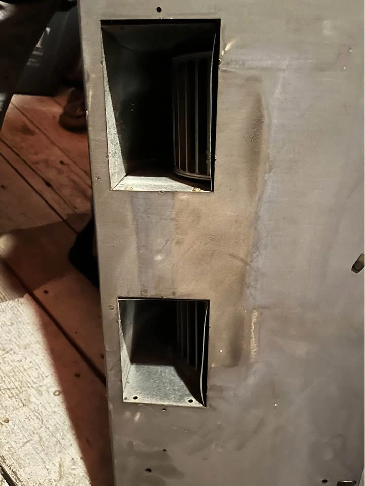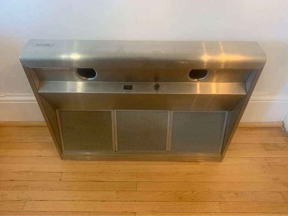 Stainless steel. In excellent working order. Replaced with a kitchen renovation. Will require replacement light bulbs. R20 (50w max) easily found. Dimensions: 30”w x 22”d x 10”h