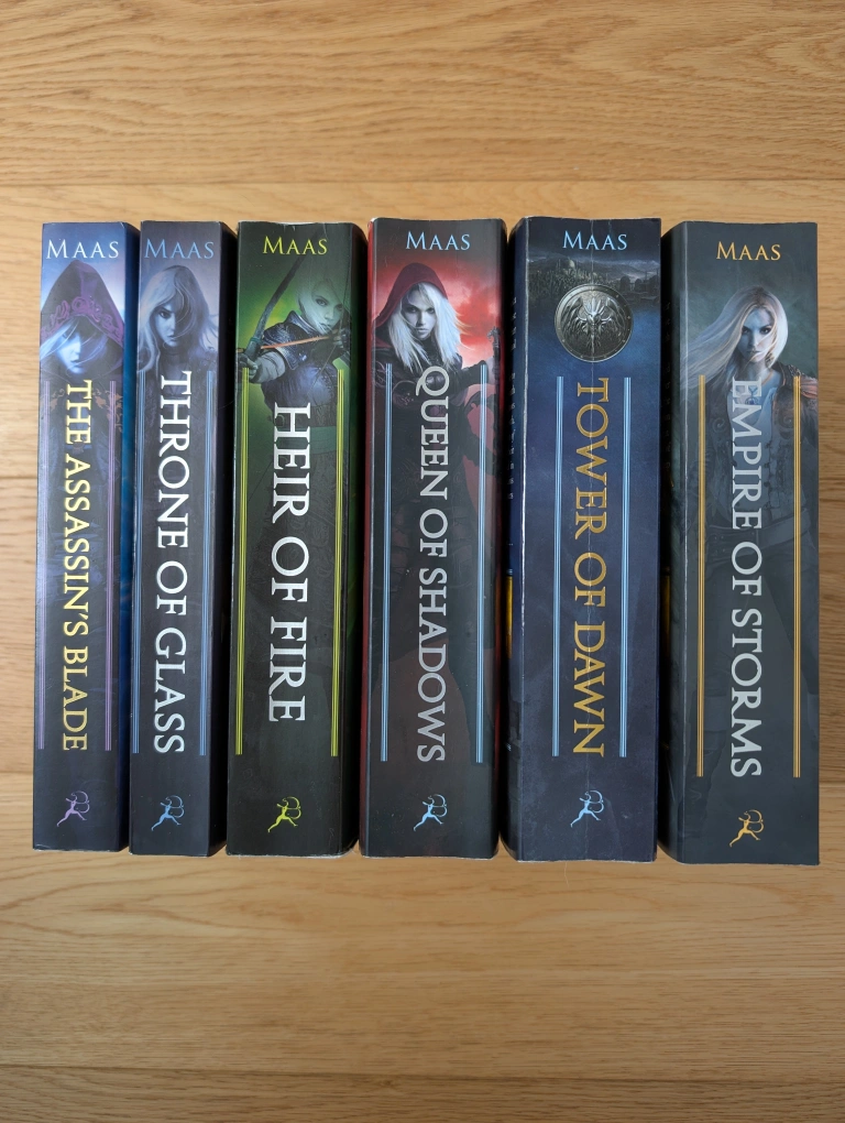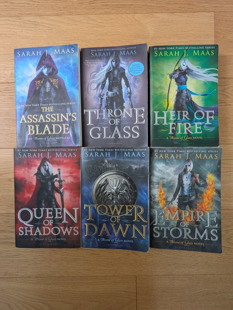 Selling the Throne of Glass series by Sarah J Maas. It includes: - The Assassin's Blade - Throne of Glass - Heir of Fire - Queen of Shadows - Empire of Storms - Tower of Dawn Some wear as shown. Selling as a set.