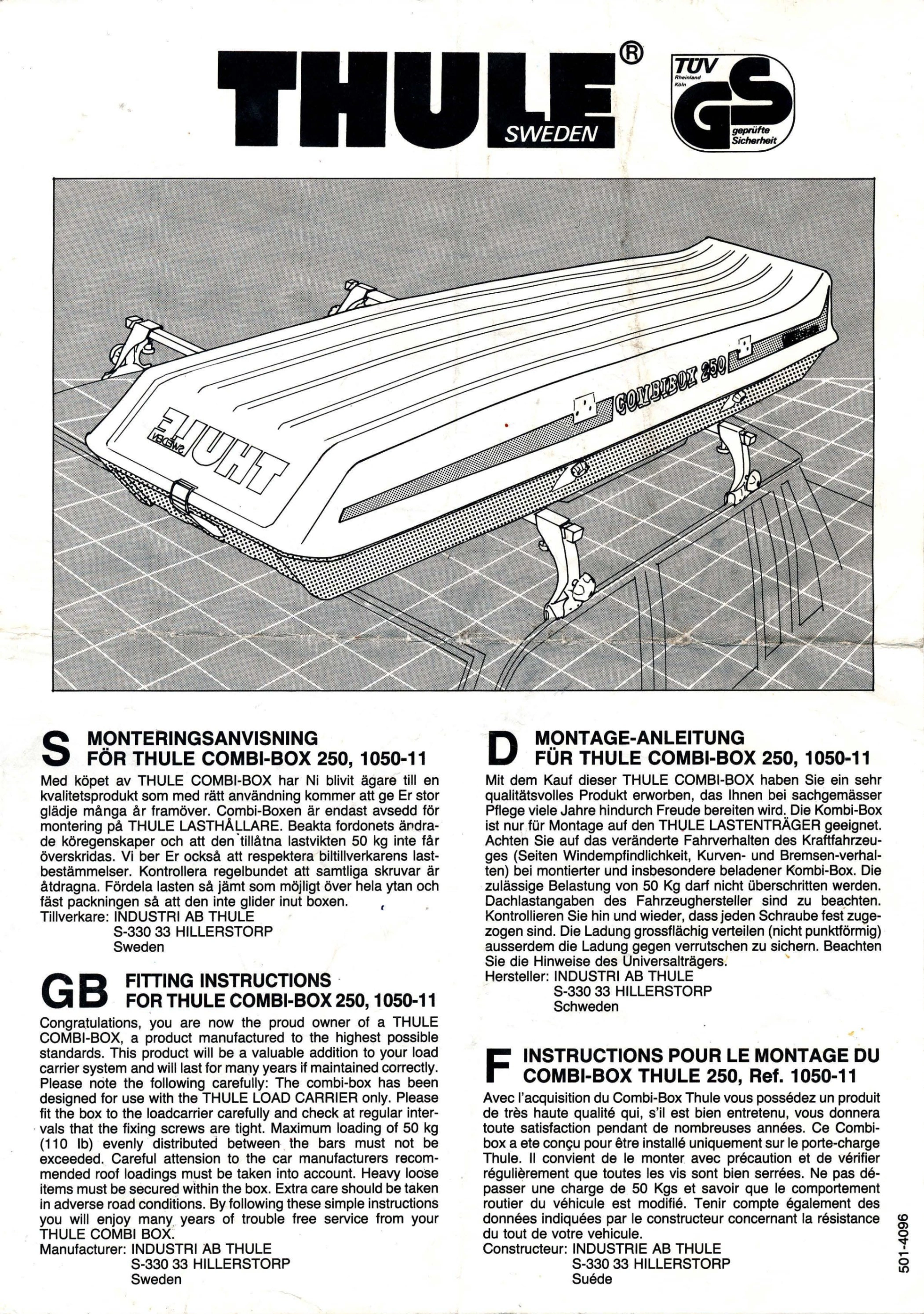 We have a Thule 250 Kombi Roof Box for sale. This is the classic Thule Box! Fits almost all rooftop cross bars. Good condition. It has small dings on the front corners. Includes mounting hardware, but one finger turning-nut is missing and needs to be replaced. Includes locking keys. Includes the original instructions. Carries skis, snowboards, bike parts, and all kinds of outdoor gear. I also have other assorted Thule roof racks, bike racks and accessories for sale. Model: 250 Kombi. Manufacturer: Thule