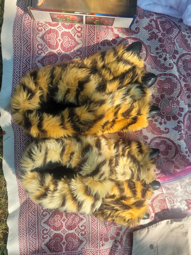 Selling these fun tiger paw slippers! They're super soft and look great. Perfect for lounging around the house on a chilly day