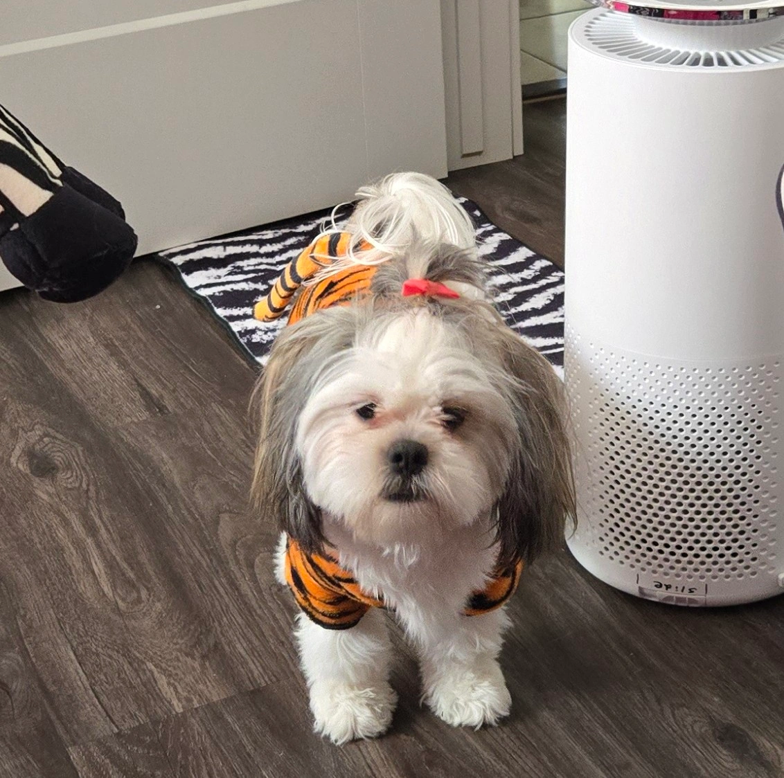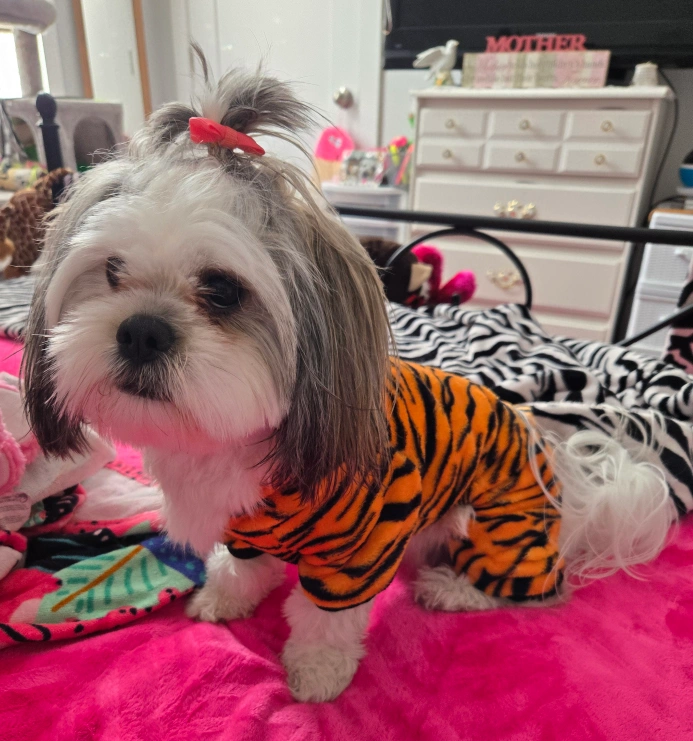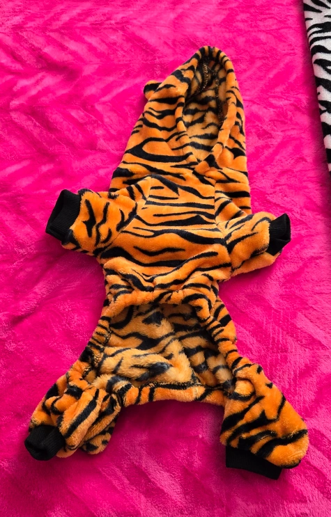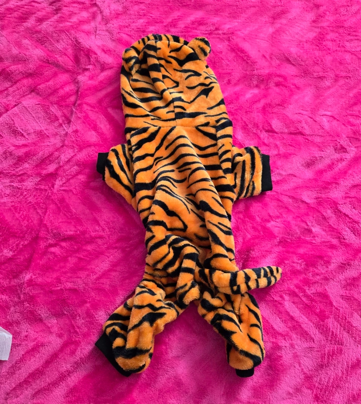 Super cute tiger print onesie for your furry friend! It's in great condition and perfect for keeping your pup warm and stylish. The onesie features a hood and a tail, adding to the adorable look. It's made of a soft, cozy material, ensuring your dog's comfort while wearing it bought it for my puppy for Halloween but its too tight on her..pick up NE Flats