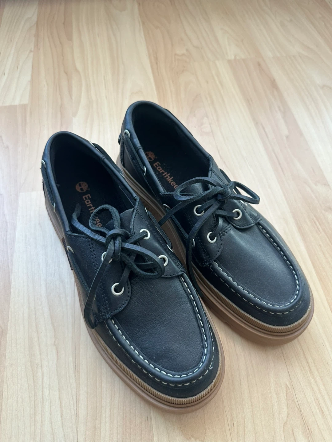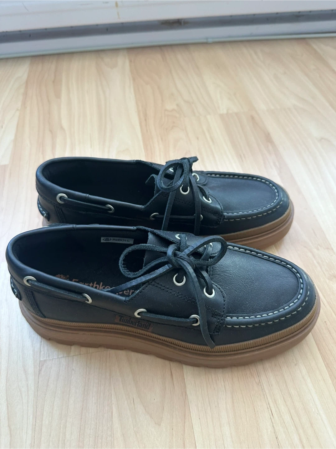 Selling a pair of Timberland Earthkeepers boat shoes! They're a stylish and comfortable choice for casual wear. These shoes feature a classic boat shoe design with black leather and a contrasting sole. The Earthkeepers line is known for its commitment to sustainability, so you can feel good about your purchase