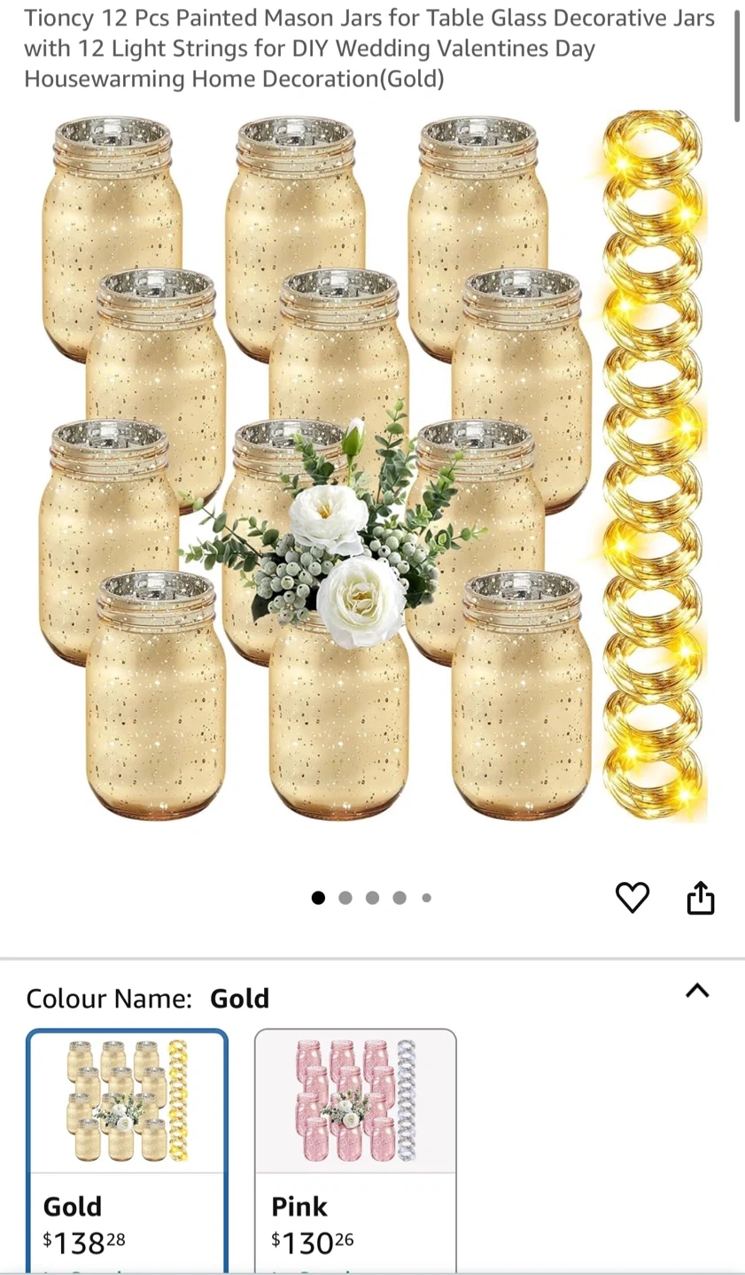 These are Tioncy 12 Pcs Painted Mason Jars for Table Glass Decorative Jars with 12 Light Strings. They are perfect for DIY Wedding Valentines Day Housewarming Home Decoration. The color is Gold. Each jar is 5.1 inch tall and 3.2 inch wide