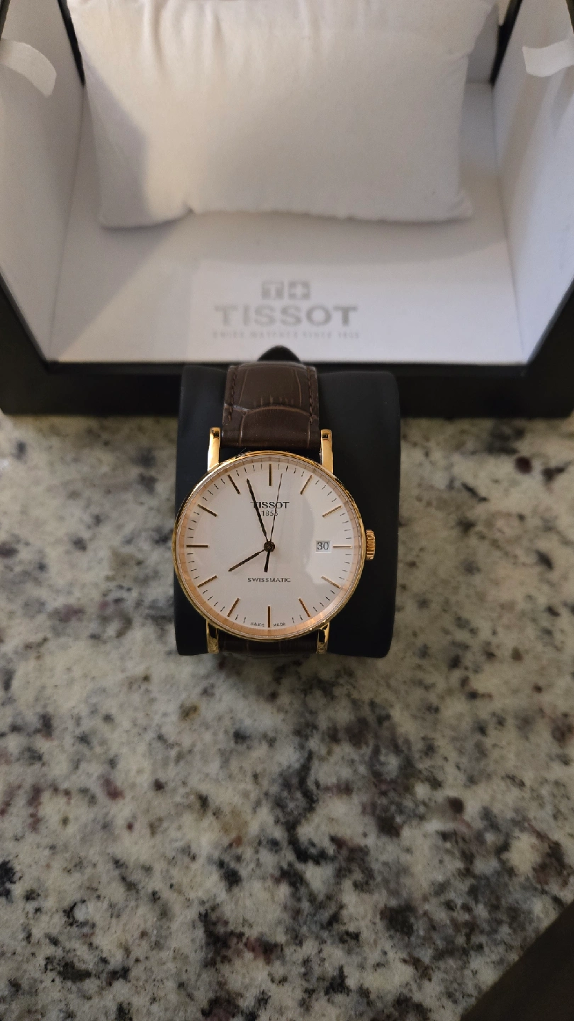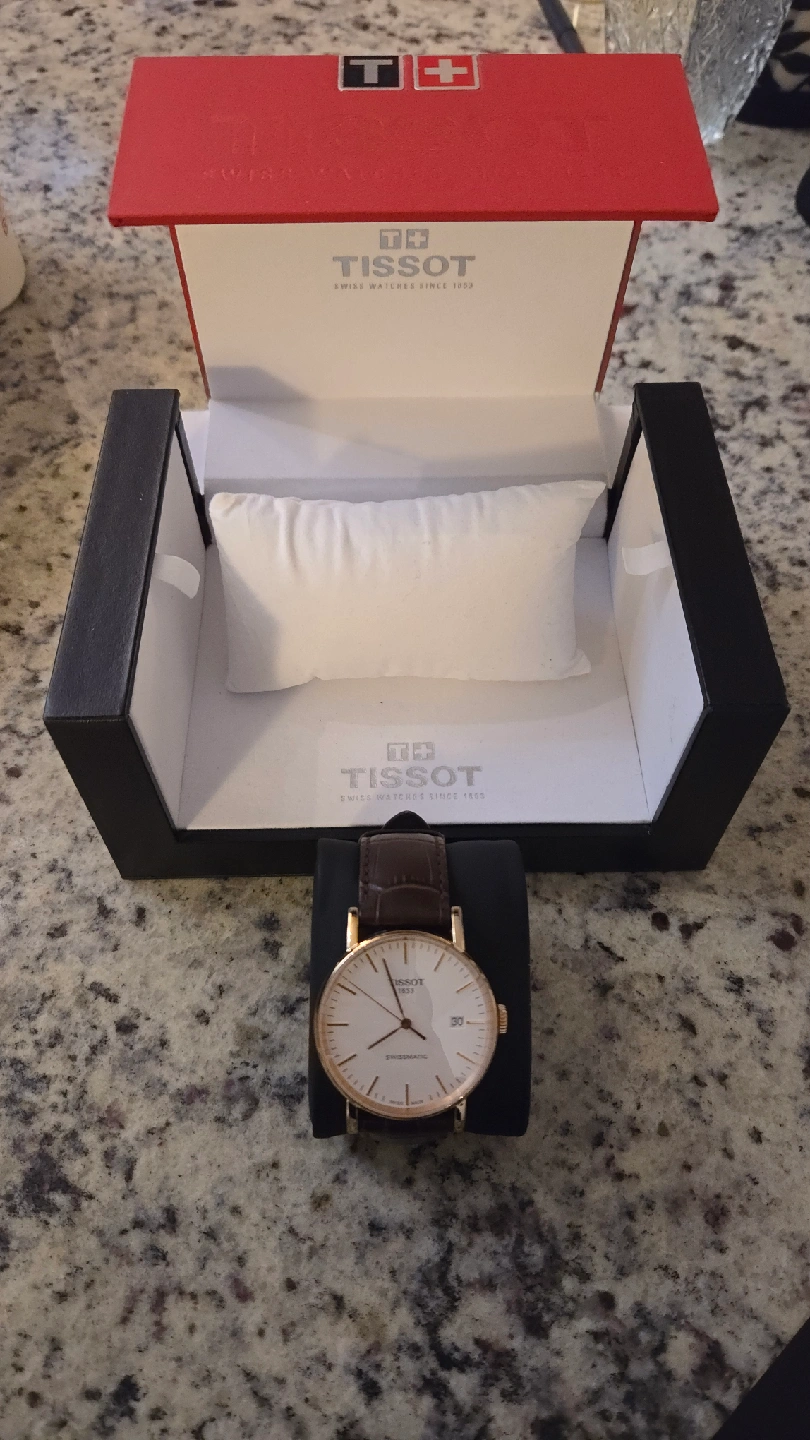 Selling a Tissot Swissmatic watch in gold! It comes with its original box. The watch features a classic design with a brown leather strap and a date window. Great for everyday wear or special occasions