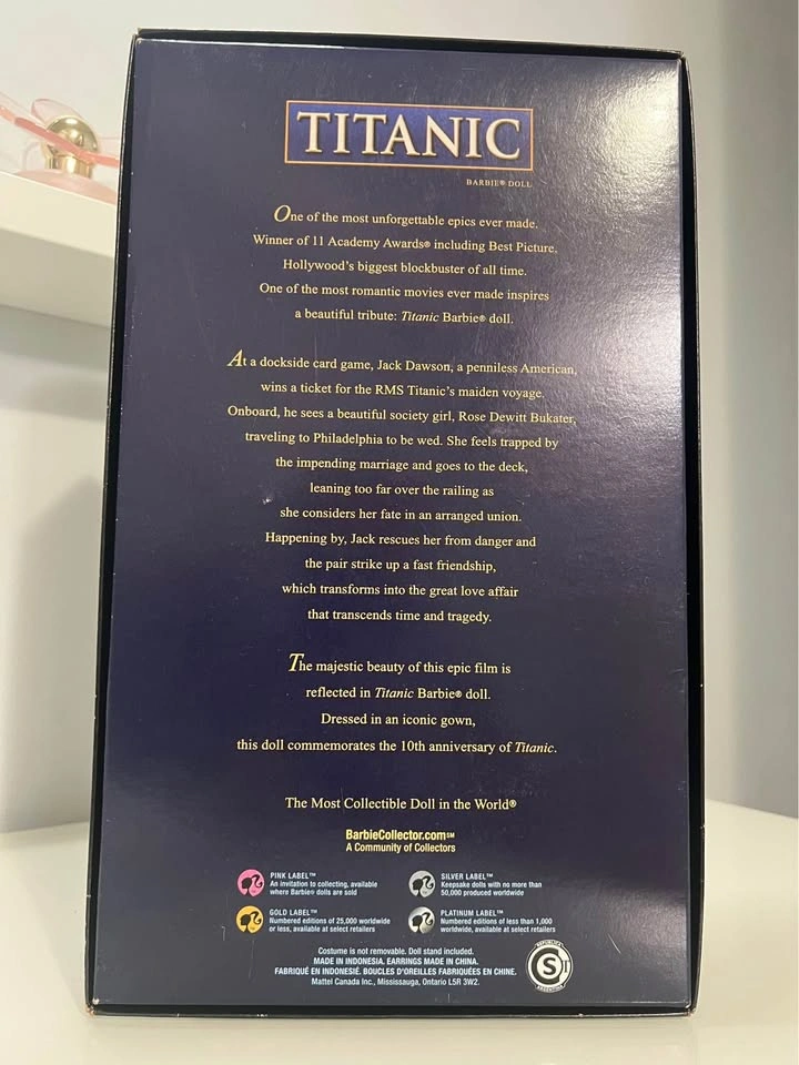 This 2007 Barbie Collector Doll is a must-have for any fan of the Titanic movie. The doll comes in its original packaging. The doll is part of the Barbie Collector product line and was manufactured in 2007.