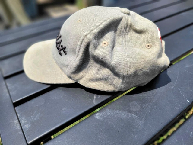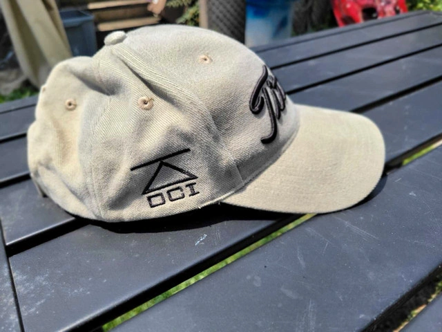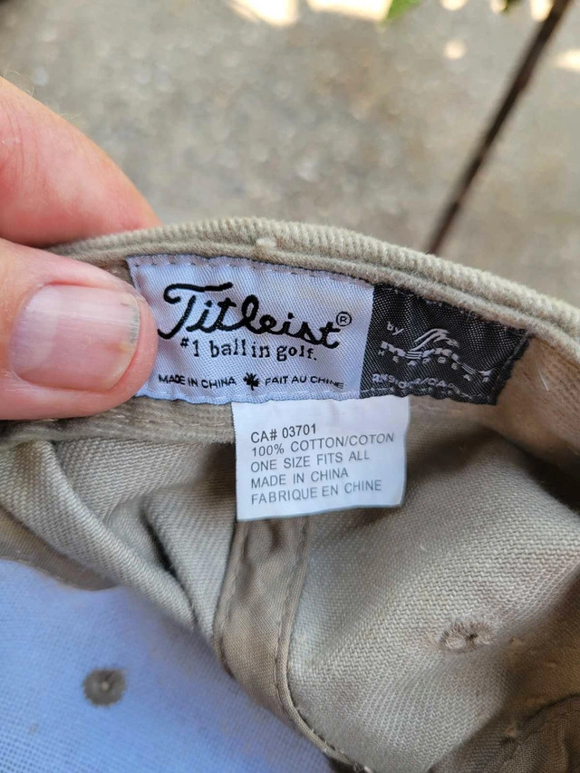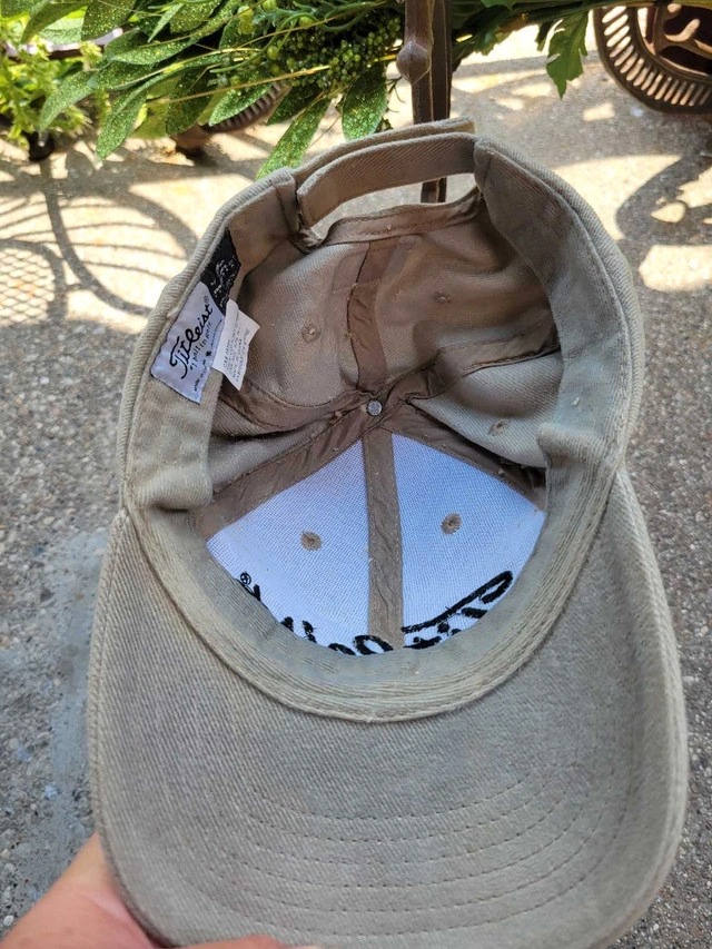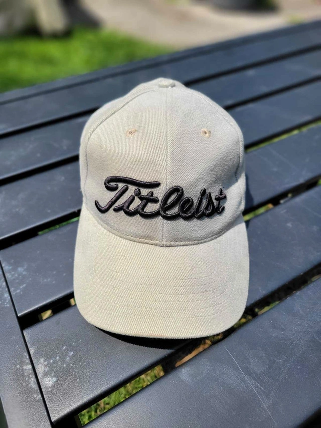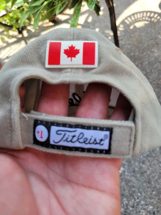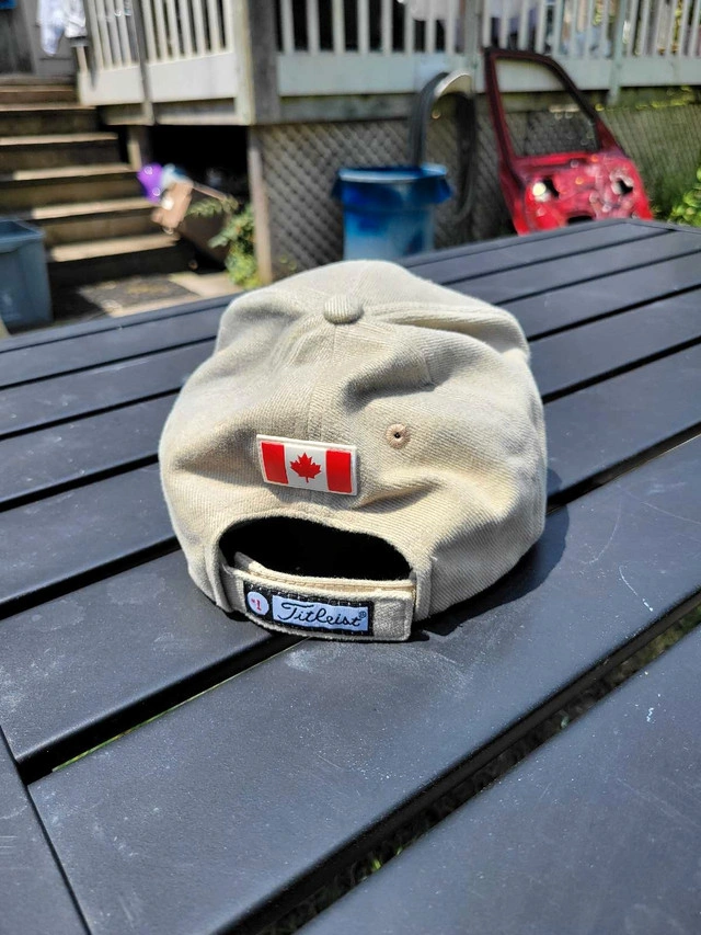 Show off your Canadian pride on the golf course with this Titleist DCI golfing cap in excellent condition. The beige hat features the iconic Canadian flag embroidered on the back, making it a must-have for any golf enthusiast. Crafted with an adjustable strap, this one-size-fits-all hat is perfect for men and provides a comfortable fit throughout your game. Ideal for sunny days, this golf hat offers protection from the sun and keeps you cool and stylish on the course. Add this vintage-inspired cap to your collection and show off your love for golf and Canada.