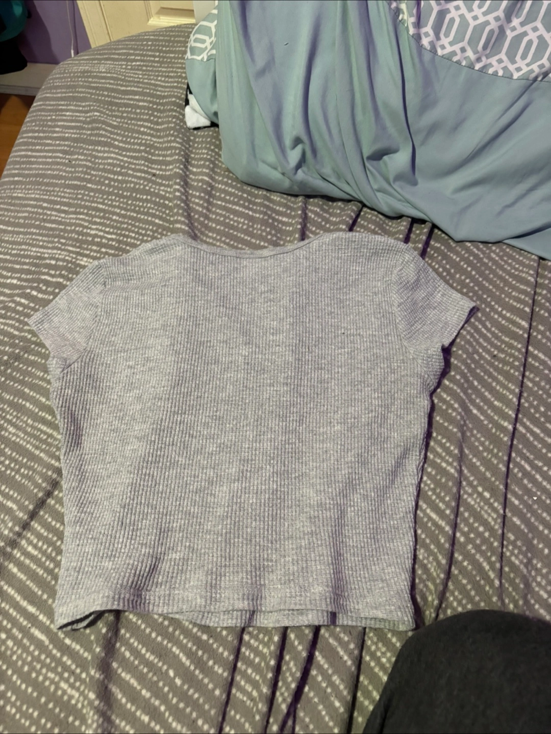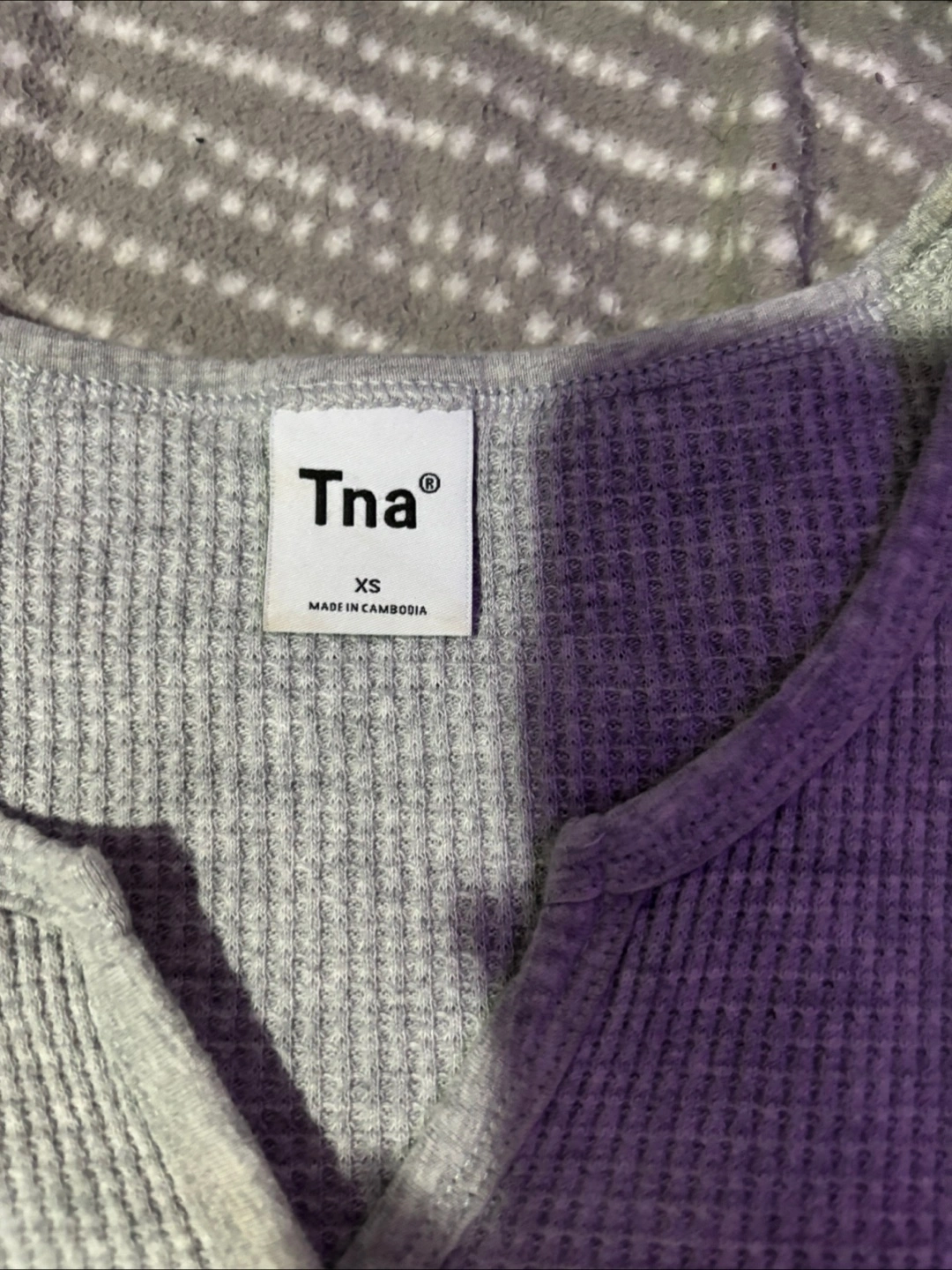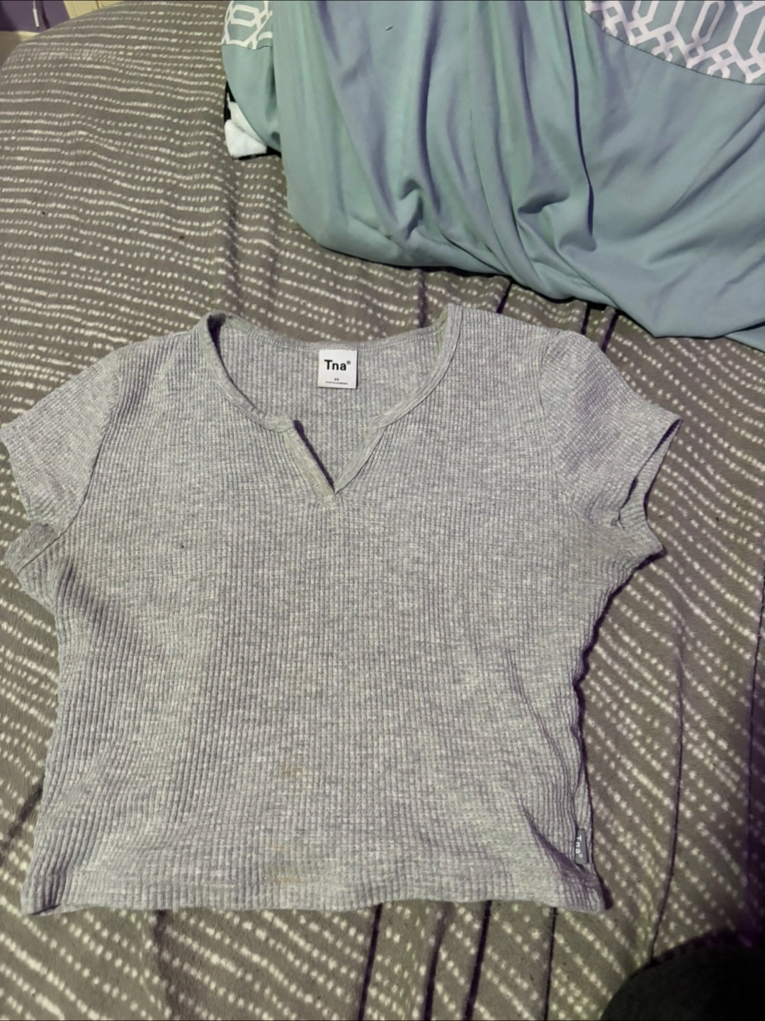 Selling a cute TNA ribbed t-shirt in a light grey colour! It's a size XS and in great condition. Perfect for casual wear!