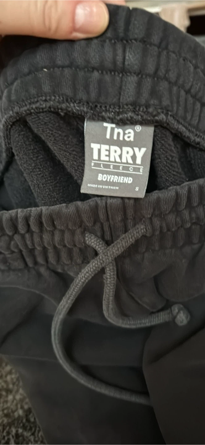 Selling a pair of Tna Terry Fleece Boyfriend sweatpants in size small! They are a comfy and casual option for everyday wear. The material is soft and cozy, perfect for lounging around the house or running errands. The boyfriend fit gives them a relaxed and stylish look. They're in great condition and ready for a new home