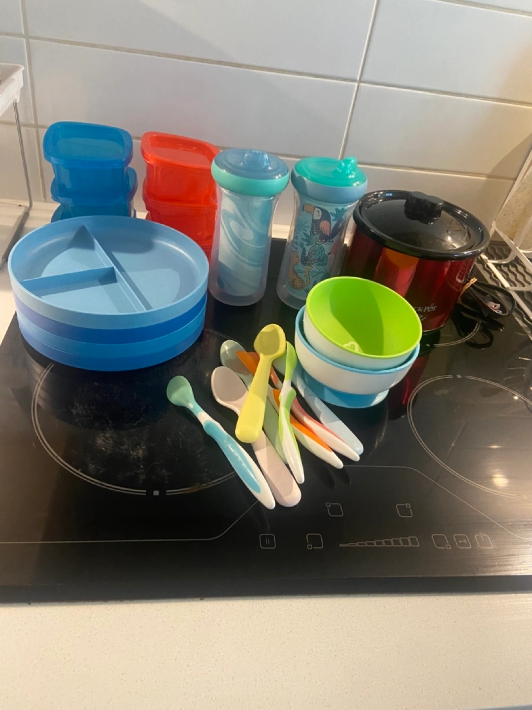 Baby/ toddler feeding set that includes plates, bowls, cups, and spoons. Small crockpot Food Storage containers dishwasher safe, microwave safe, and freezer safe