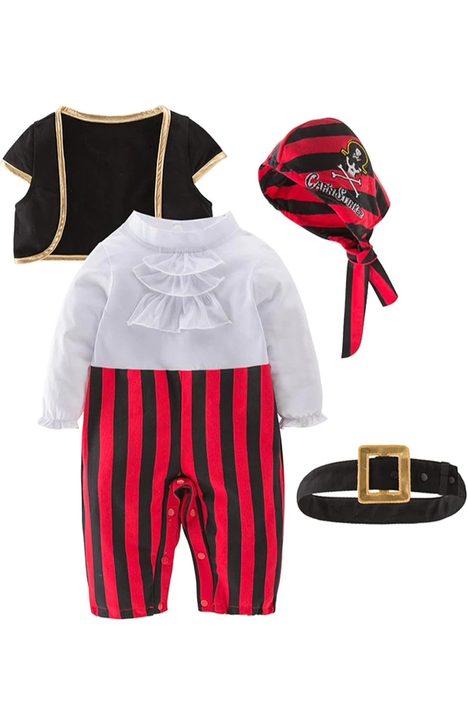 Ahoy there, mateys! I'm selling a toddler pirate costume, perfect for dress-up or Halloween. The costume includes a striped headscarf, a vest, a long-sleeved shirt, striped pants, and a belt. 18-24 months