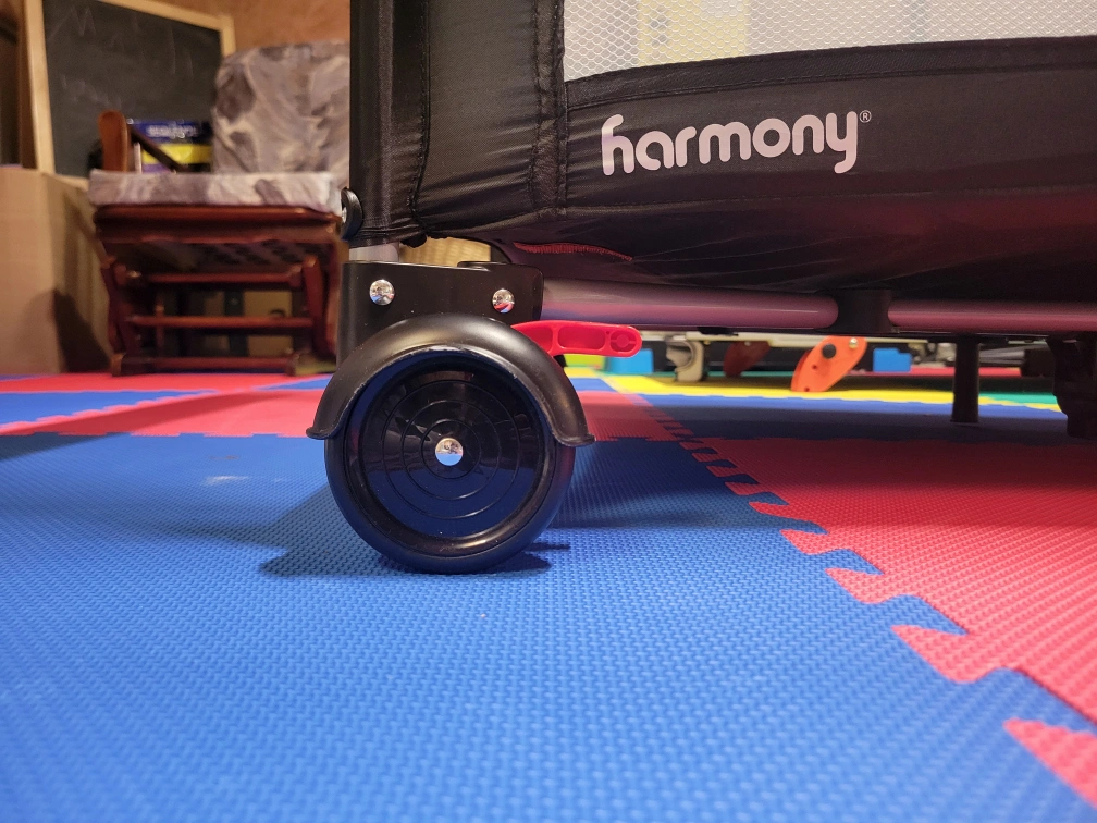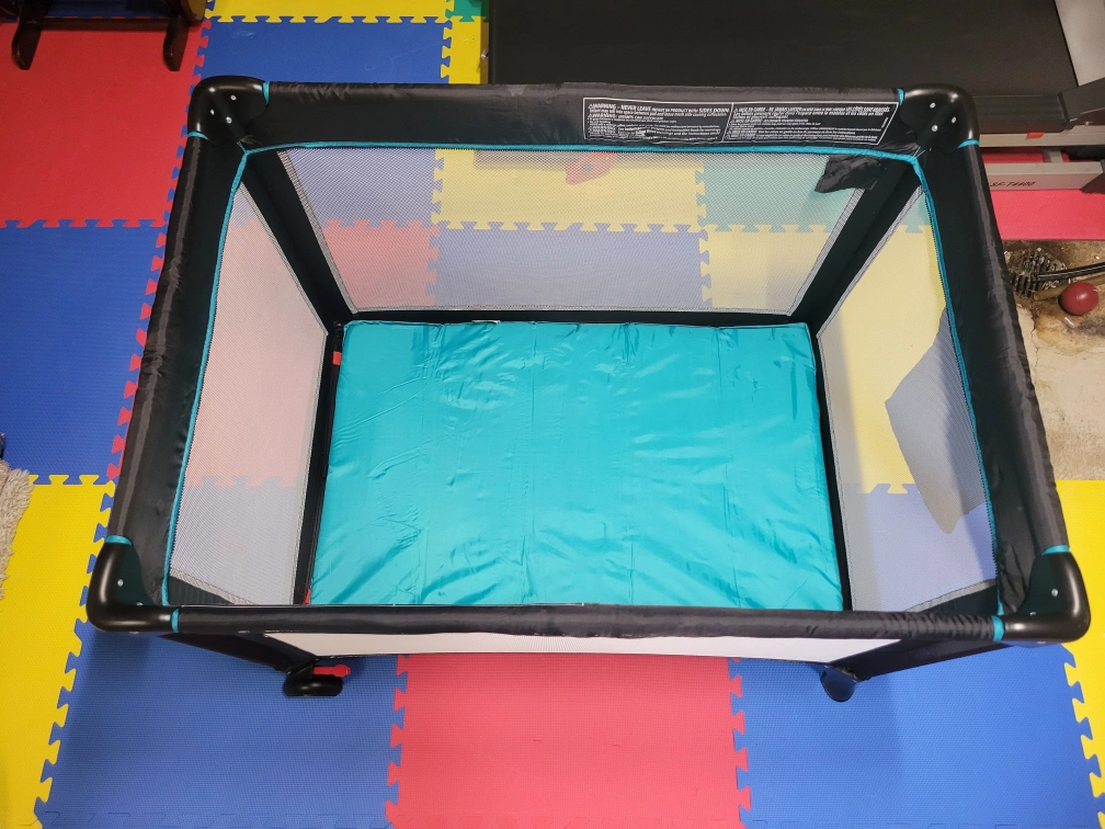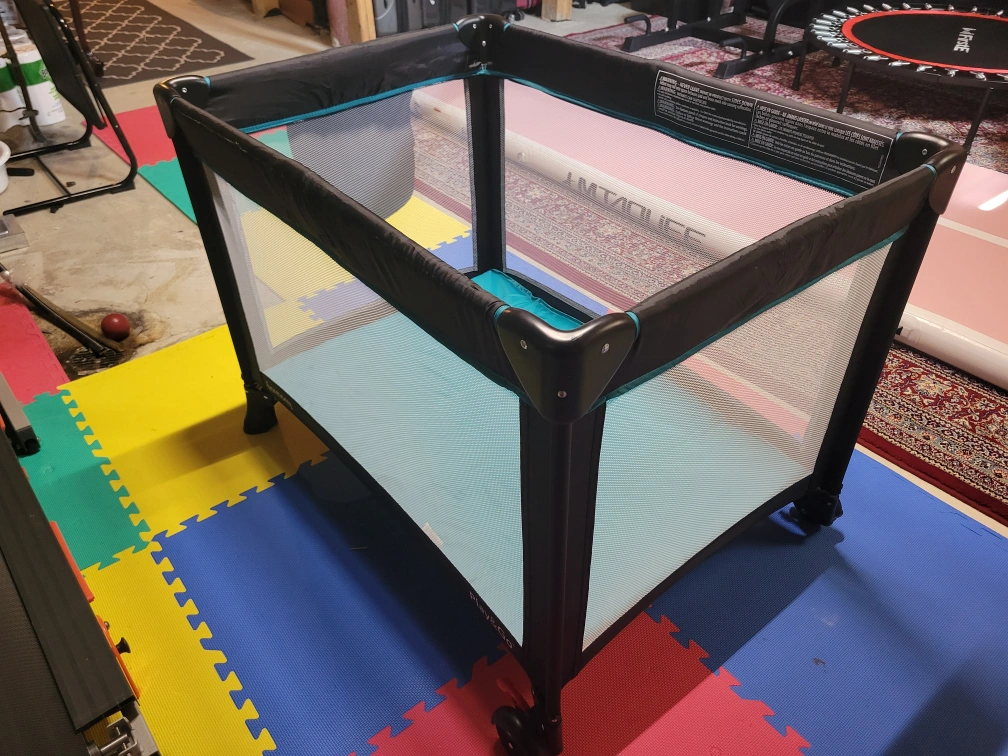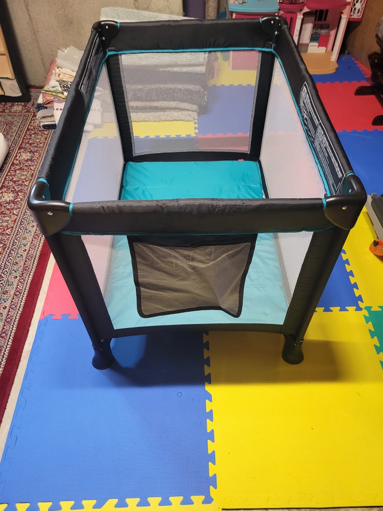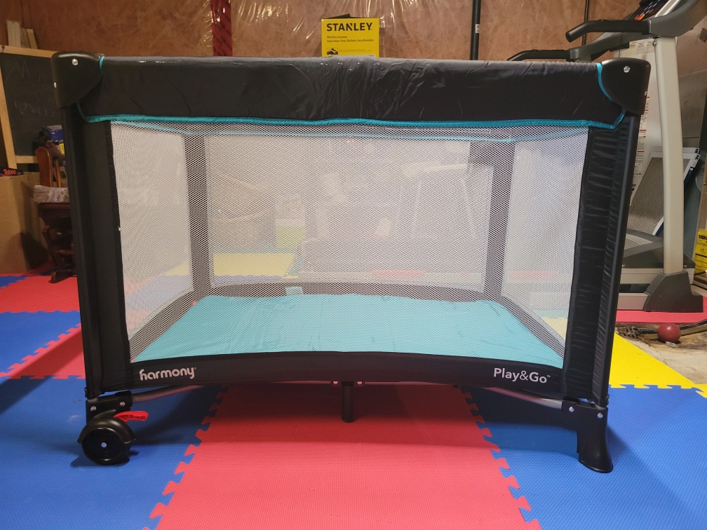 Selling a Harmony Play&Go playard. It's in great condition and perfect for travel or home use! This Playpen is lightweight and has wheels for easy portability. It includes a padded mattress making it perfect for toddler use. It also comes with a mobile attachment with a star and moon.