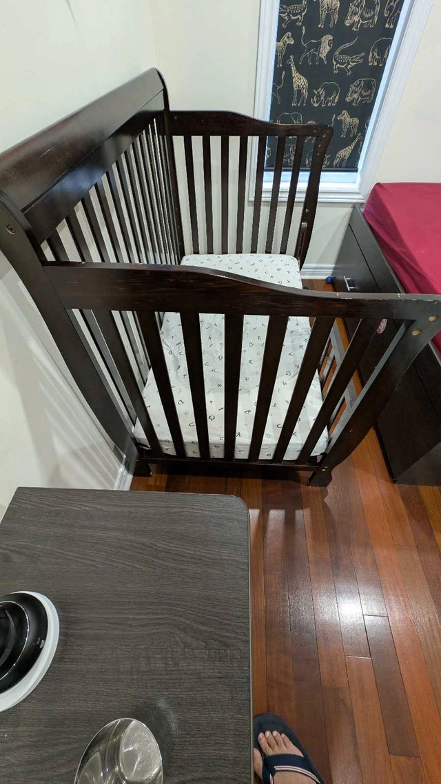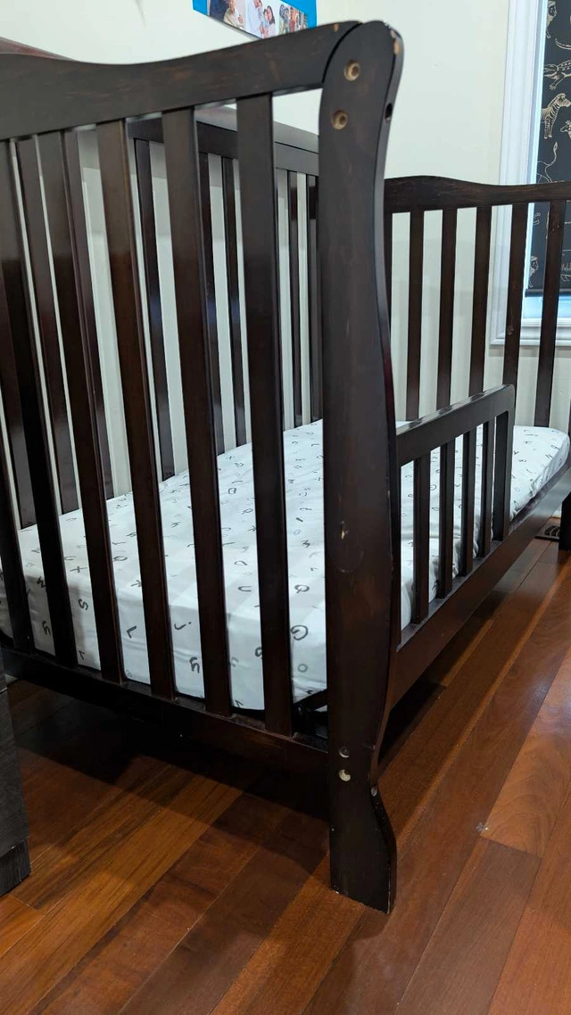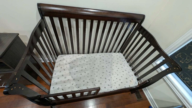 This is a gently used Toddler's bed / crib in good condition, perfect for your little one's nursery. It features a sturdy wooden frame and a classic design that will complement any decor. The crib is currently assembled, but I can disassemble it for easier transport if needed. * Convertible: Crib to toddler's bed * Material: Wood * Colour: Dark Brown *** Accessory to convert it back to crib is included. Looking to give this lovely crib a new home! Don't miss out – if you see this ad, it's still up for grabs!