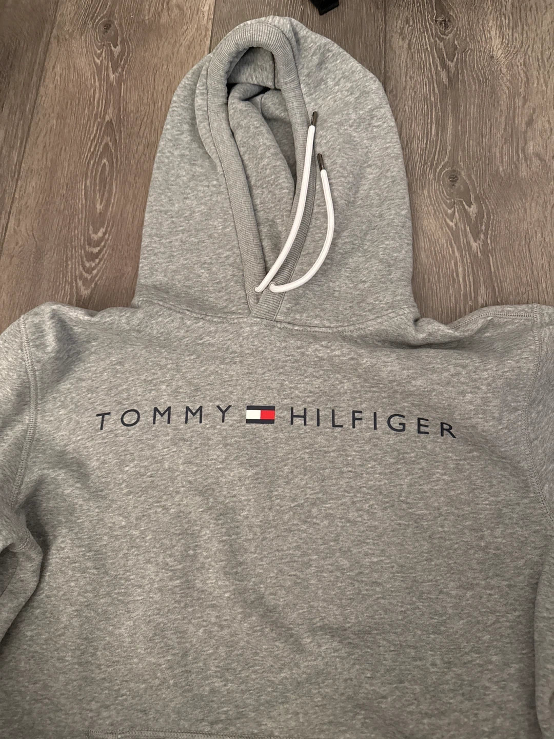Selling a comfy Tommy Hilfiger hoodie in grey. It's in great condition and ready for a new home! Perfect for layering or just lounging around.