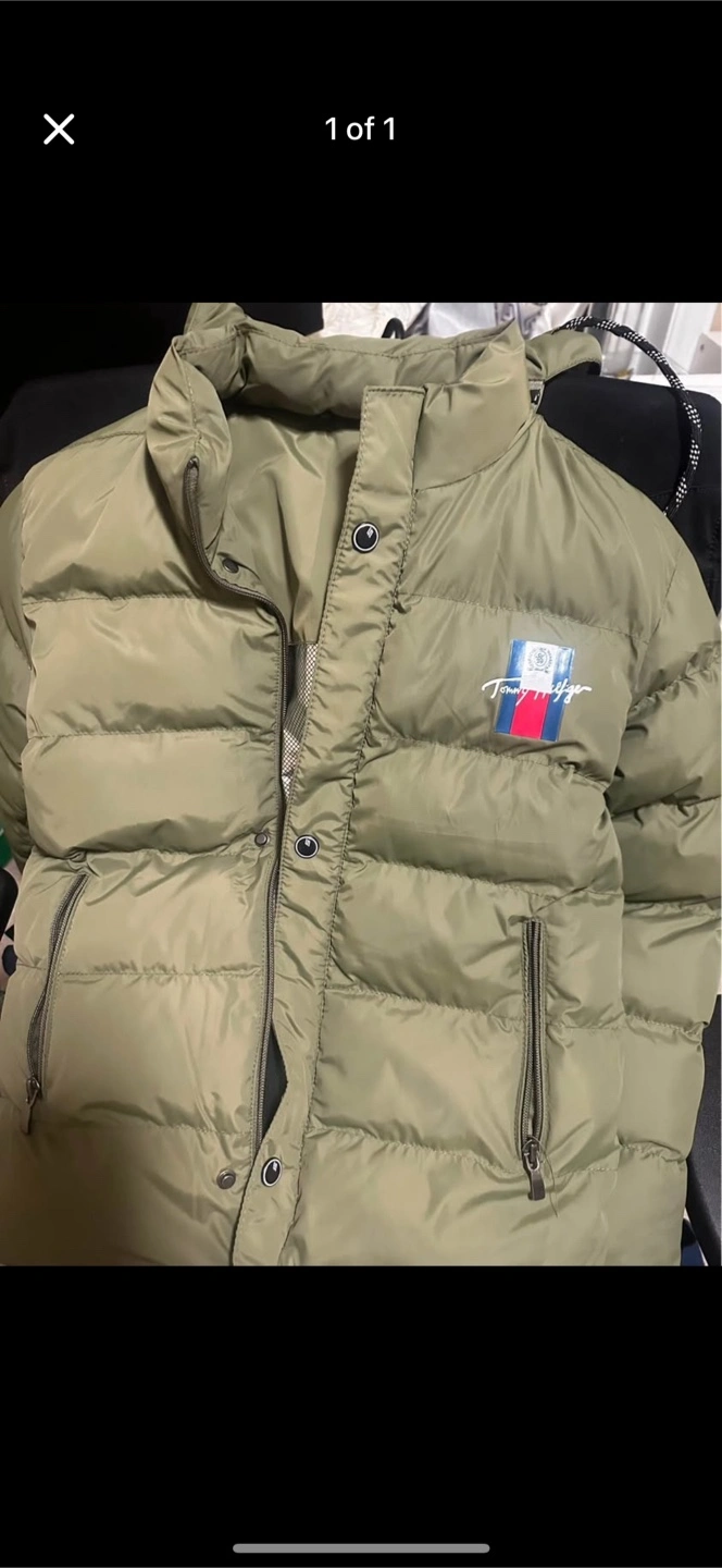 Boys aged 6-7 olive green puffer jacket. Features a zipper and snap closure. Two zippered pockets. Tommy Hilfiger branding on the chest.