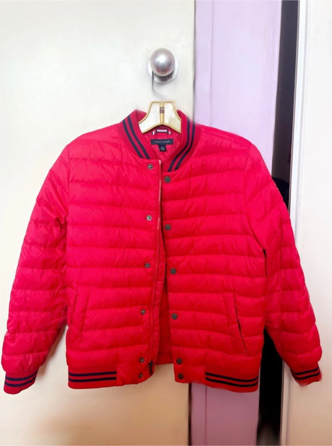 Description: Bright red puffer jacket from Tommy Hilfiger It's in great condition The jacket features a classic bomber style with striped detailing on the collar, cuffs, and hem. It's lightweight and easy to wear Condition: Used once, like new Original price: Around $120 Color: Red