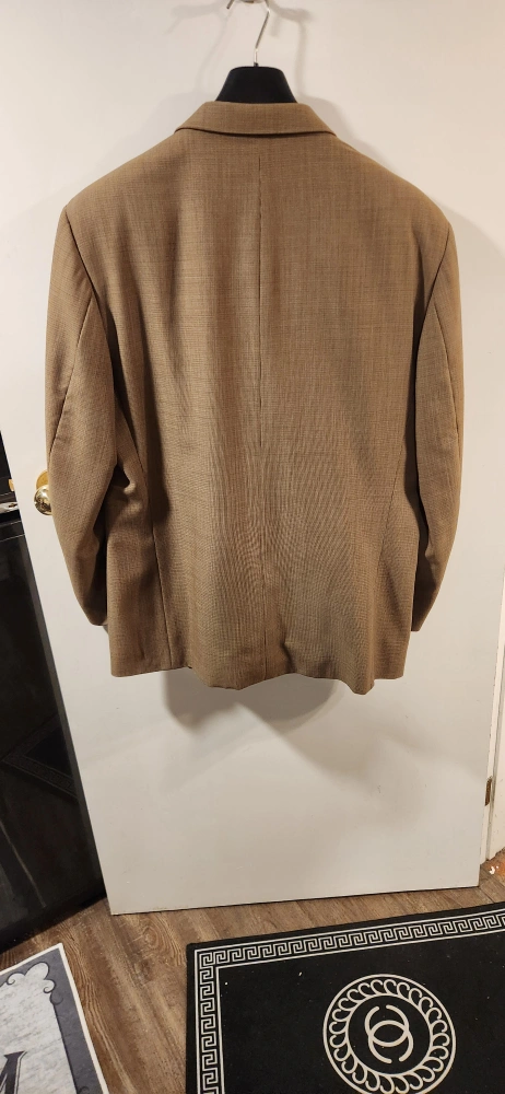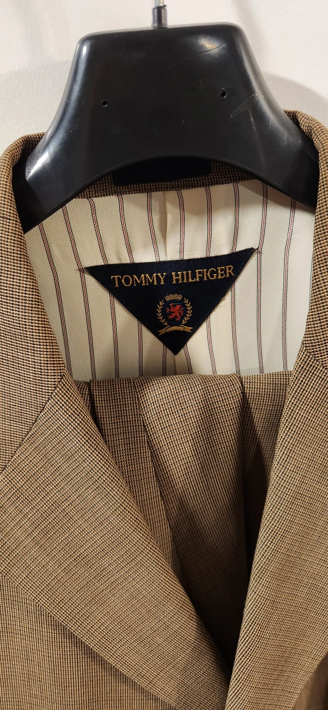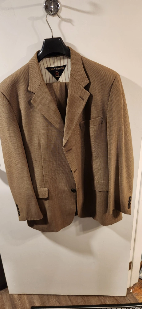 This Tommy Hilfiger suit features a stylish brown and tan patterned blazer with matching pants, perfect for a sophisticated look. The suit is in good condition, showing some signs of wear but still looking sharp. Additional specifications: * Brand: Tommy Hilfiger * Colour: Brown/Tan Dry clean only. Pure virgin wool. The jacket is 44 R and the pants are 36 /38. In excellent condition. Pick up in Orleans.