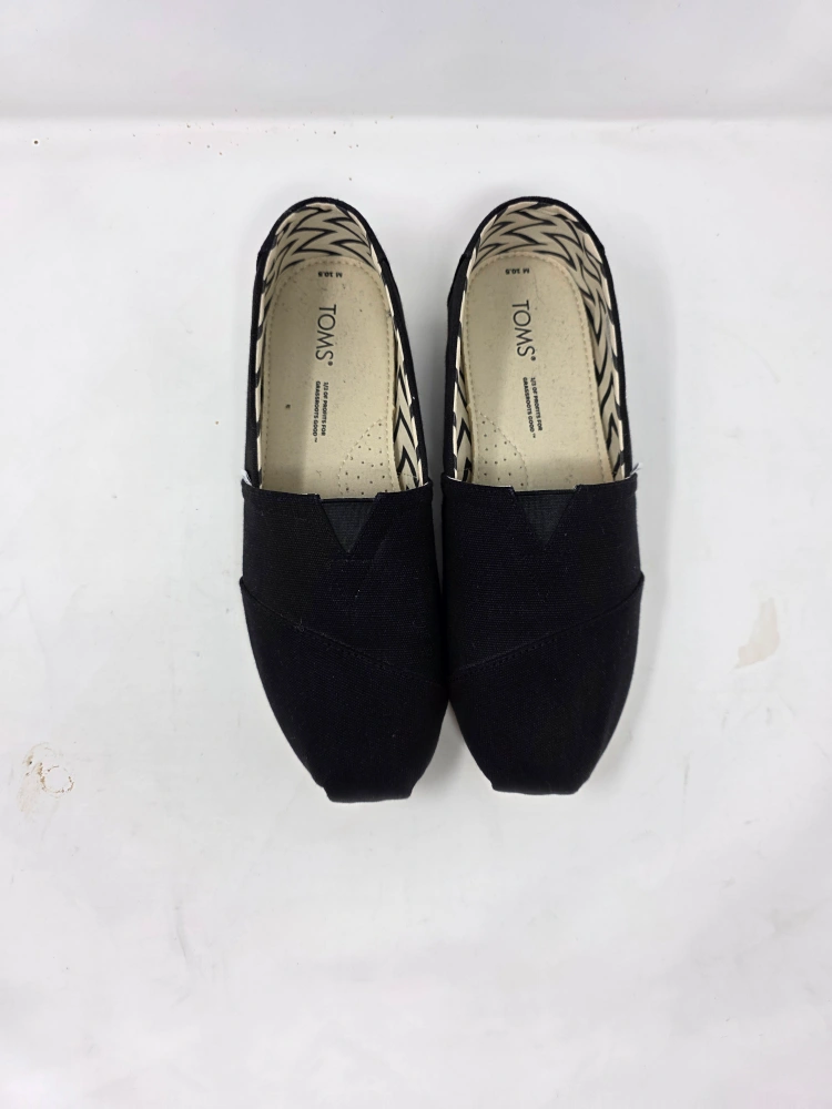 These slip-on shoes are mostly black with a tan sole. There is an interior pattern featuring a black and white zigzag pattern. I hope you find these shoes as comfortable as I do, as they're perfect to wear while relaxing. model Alpargata