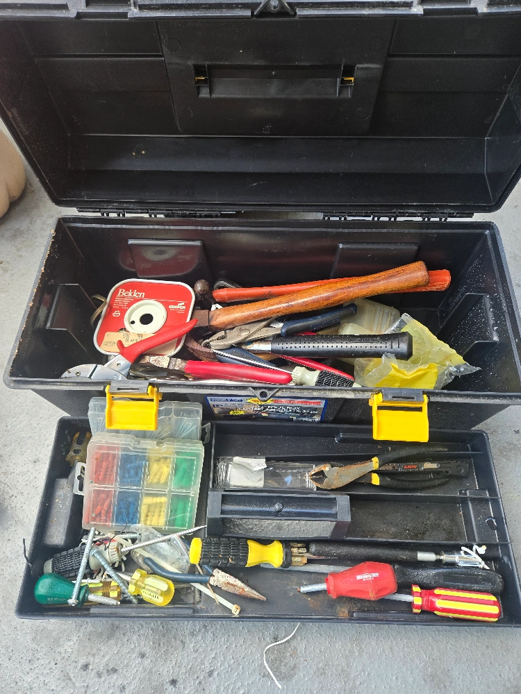 Toolbox filled with a variety of tools. Includes Belden electrical tape, hammers, screwdrivers, pliers, and a selection of electrical connectors. Great for DIY projects or home repairs