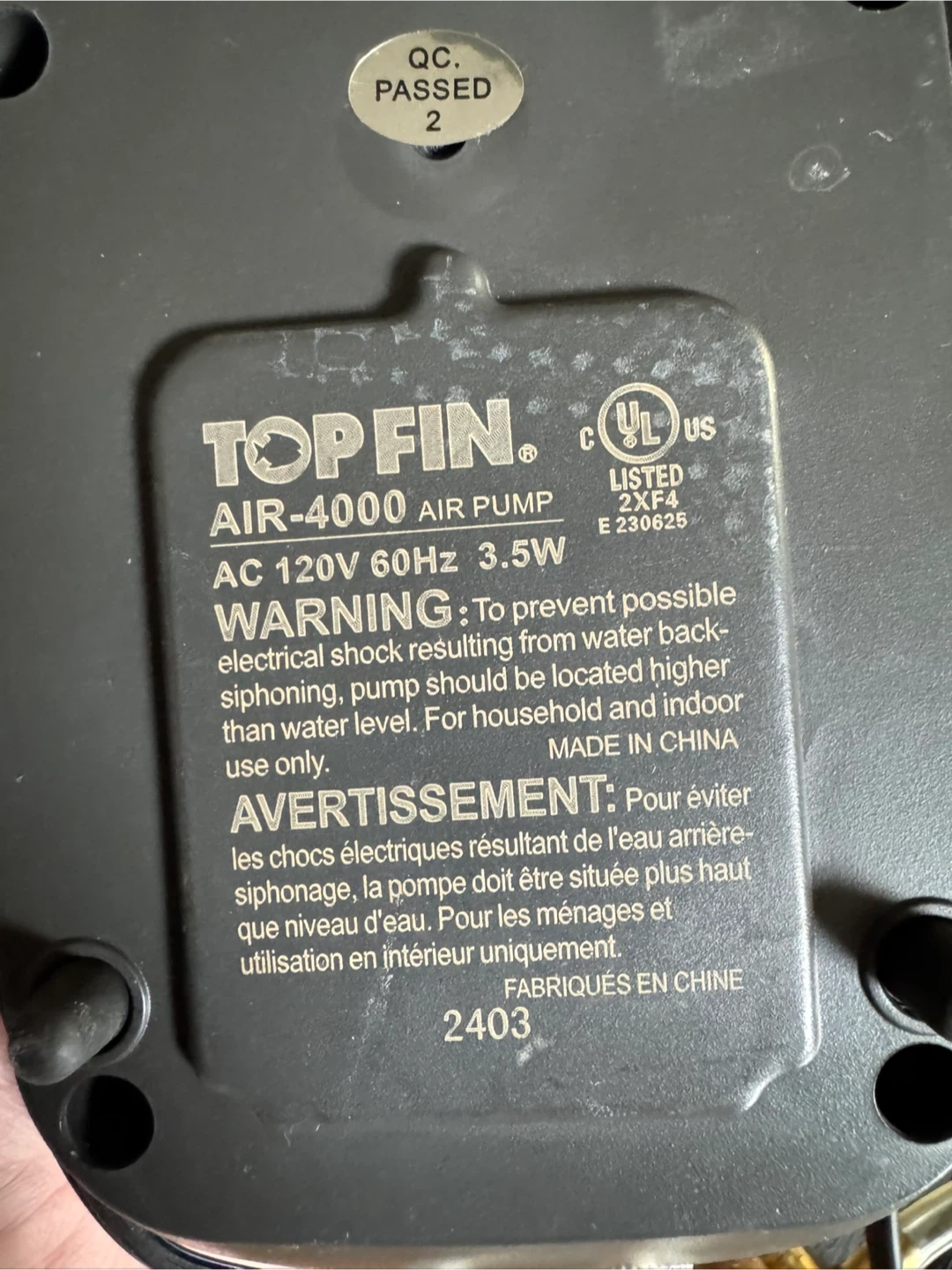 Selling a Top Fin AIR-4000 air pump for aquariums. It's in good working condition and ready to aerate your fish tank. This pump is designed for household and indoor use.
