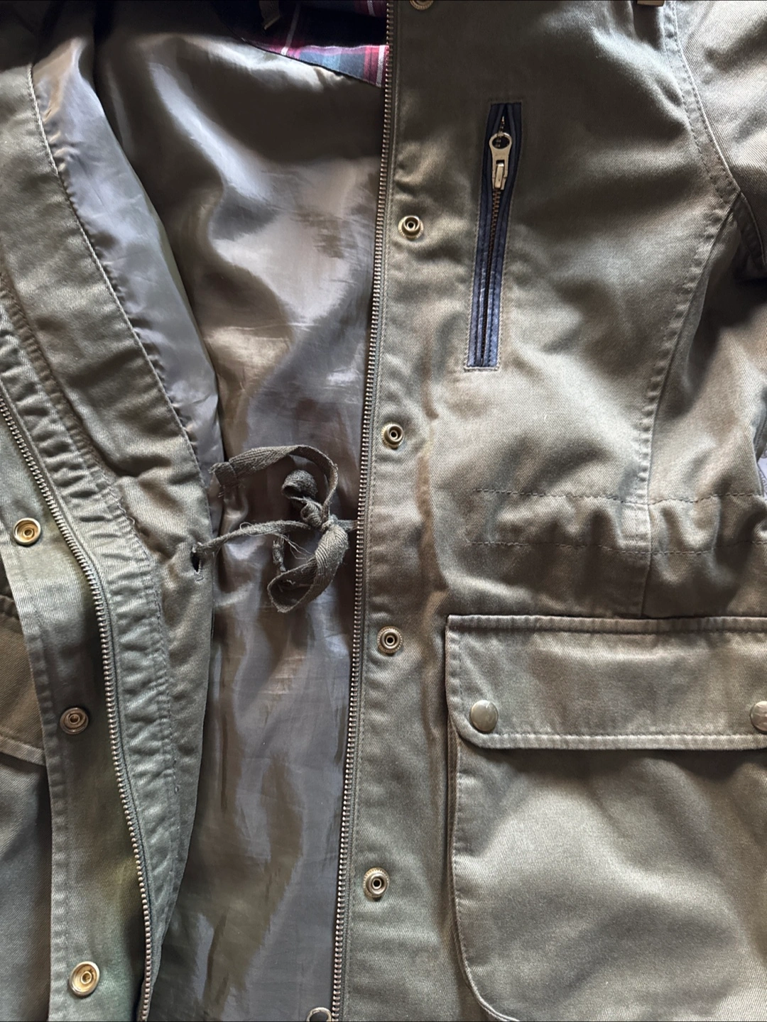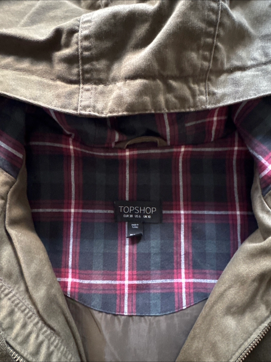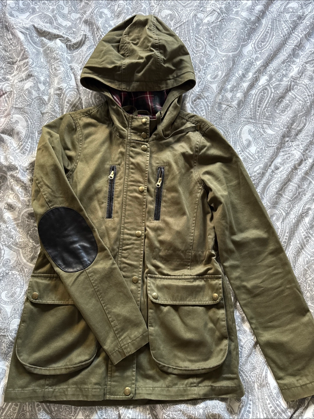 Selling a cute Topshop hooded jacket in olive green! It's a size US 6. The jacket features a hood with a plaid lining, front pockets, and stylish elbow patches. Perfect for layering!