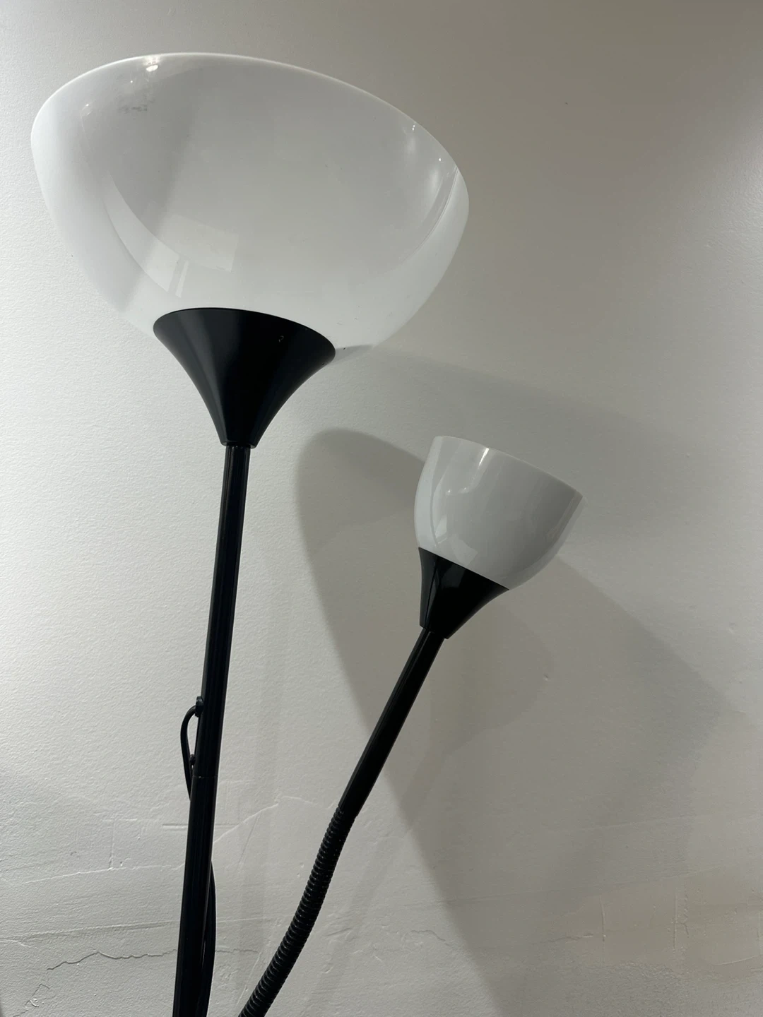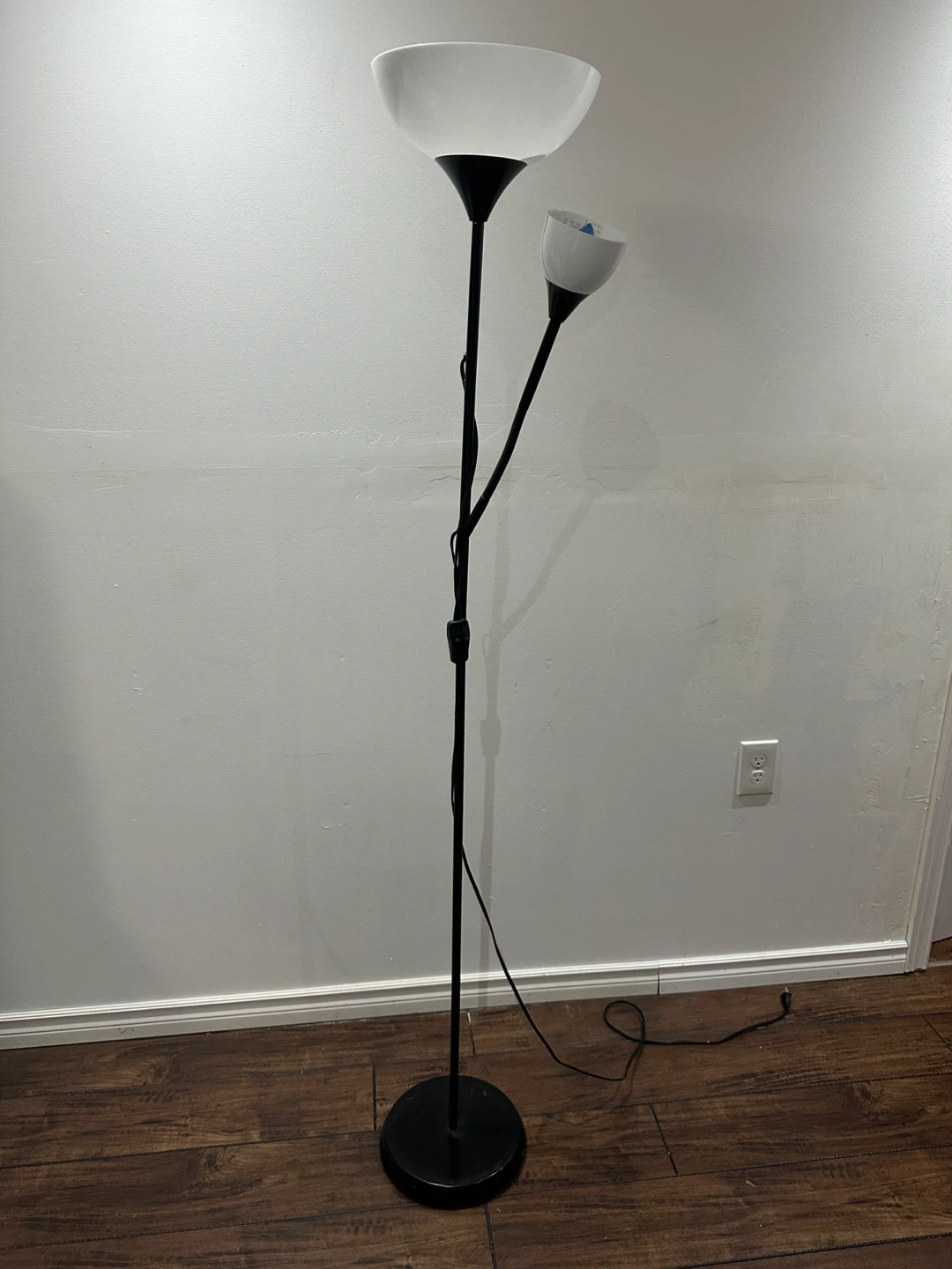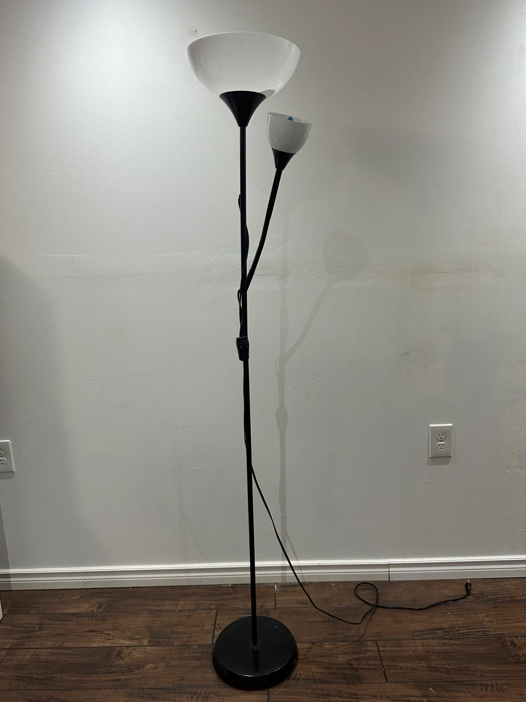 This is a Torchiere floor lamp in black with a reading light. It's a great way to add some extra light to any room. The lamp is in good condition and ready for a new home!