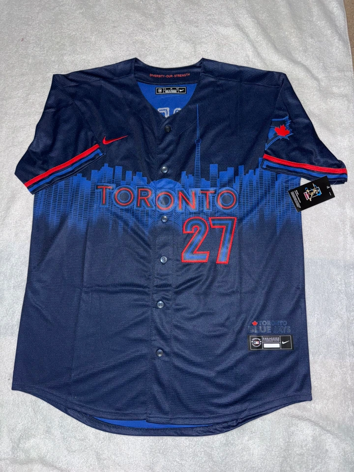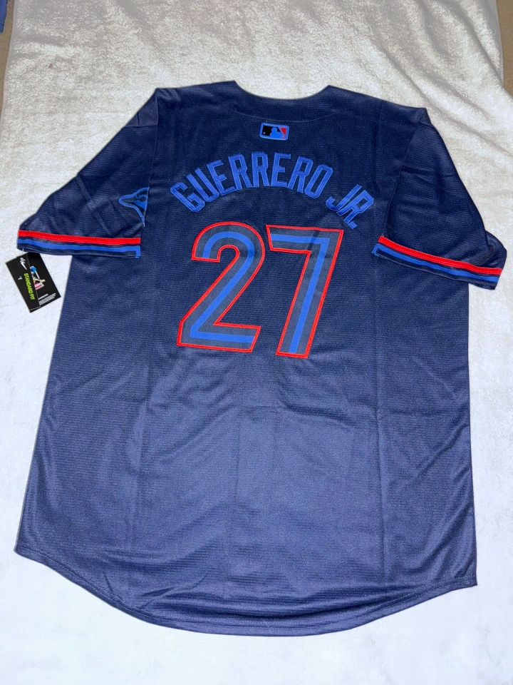 Selling a Toronto Blue Jays jersey featuring Guerrero Jr. and the number 27! The jersey is in great condition and features the Toronto skyline design. Perfect for any Blue Jays fan! sizes large to xxl