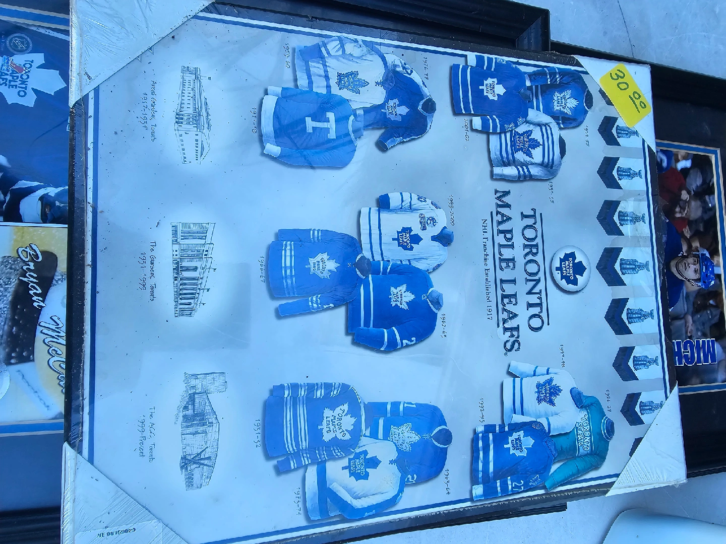 Selling a framed poster showcasing the history of the Toronto Maple Leafs. It features various jerseys and historical facts about the team and its arenas. A great piece for any Leafs fan!