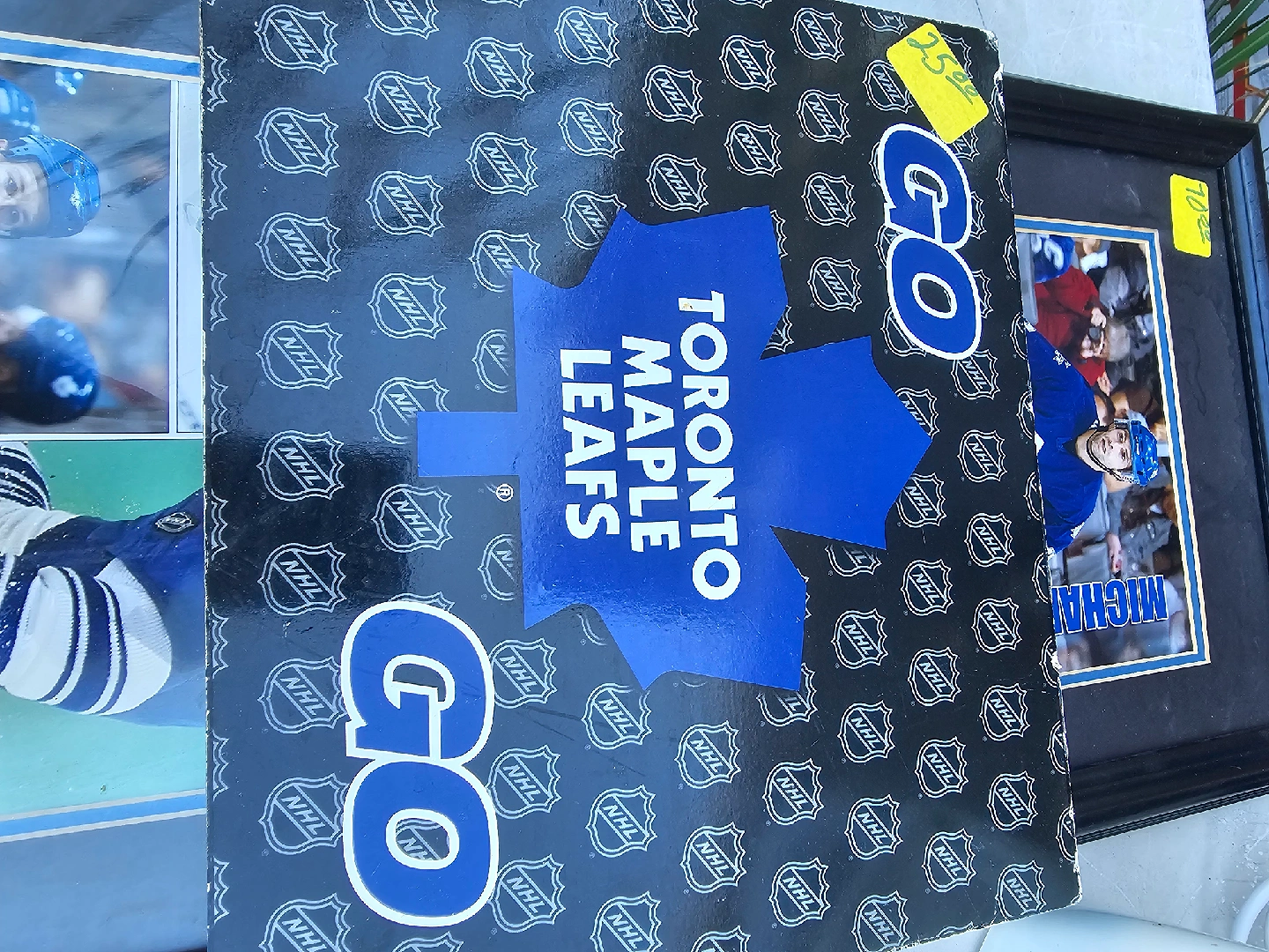 Selling two framed pictures of the Toronto Maple Leafs. One has a blue maple leaf logo and the other is a picture of a player in action. Great for any Leafs fan's collection!
