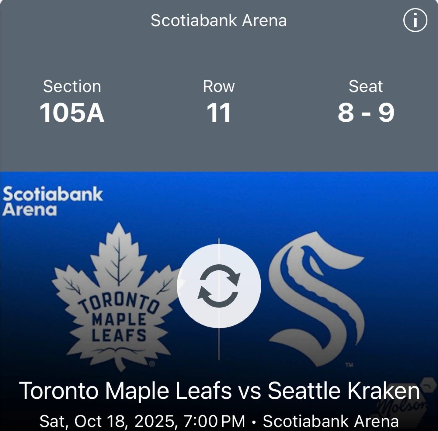 Selling 2 tickets to see the Toronto Maple Leafs play the Seattle Kraken at Scotiabank Arena. The game is on Saturday, October 18, 2025, at 7:00 PM. Seats are in Section 105A, Row 11, Seats 8-9