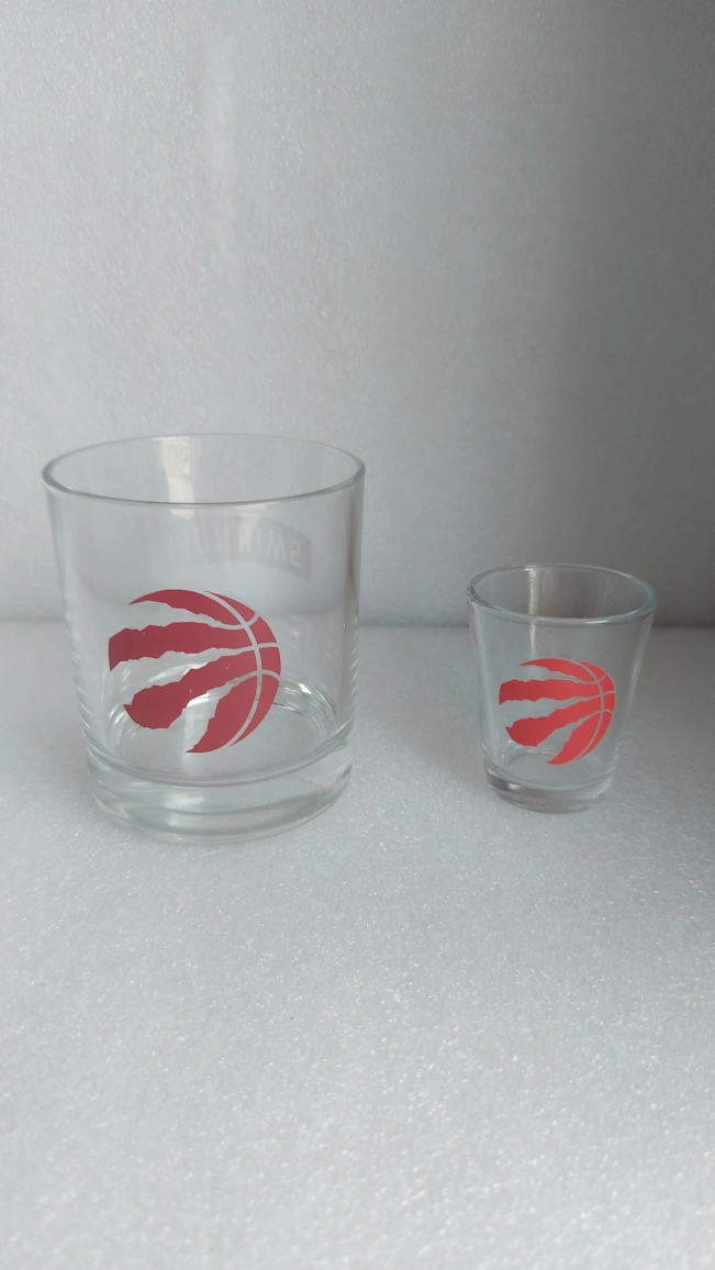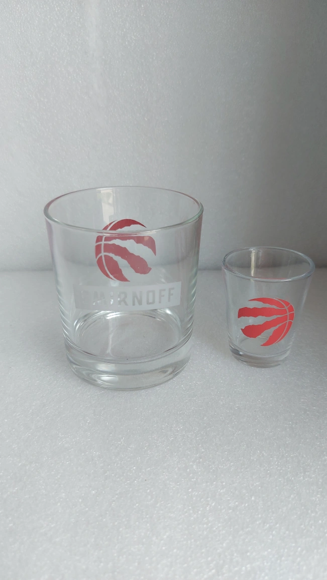 Selling a set of two glasses featuring the Toronto Raptors logo and Smirnoff branding. One is a larger rocks glass, and the other is a smaller shot glass. Perfect for any Raptors fan or home bar!