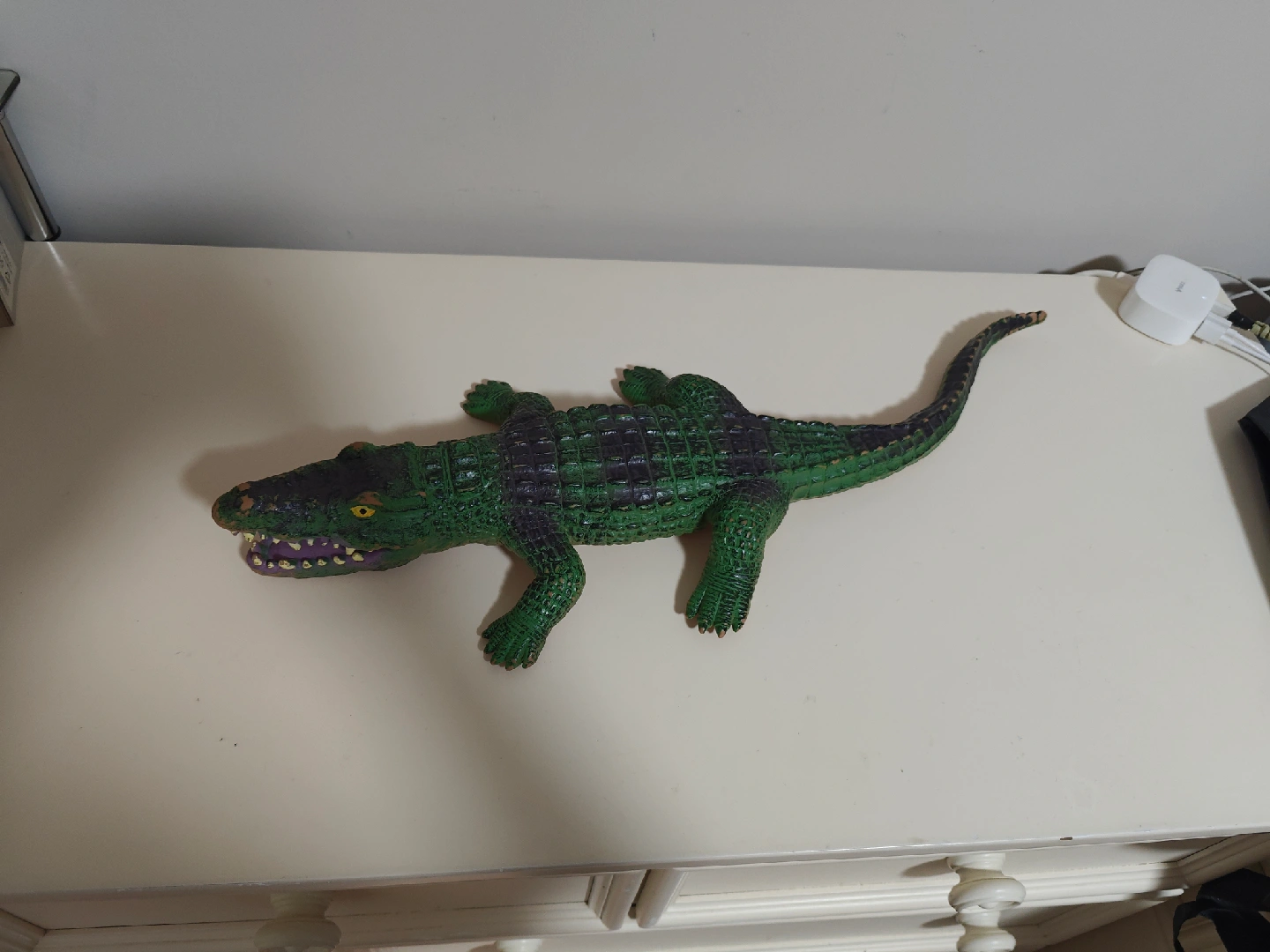 Selling a toy alligator. It's green and purple. It looks like it's in good condition and ready for a new home