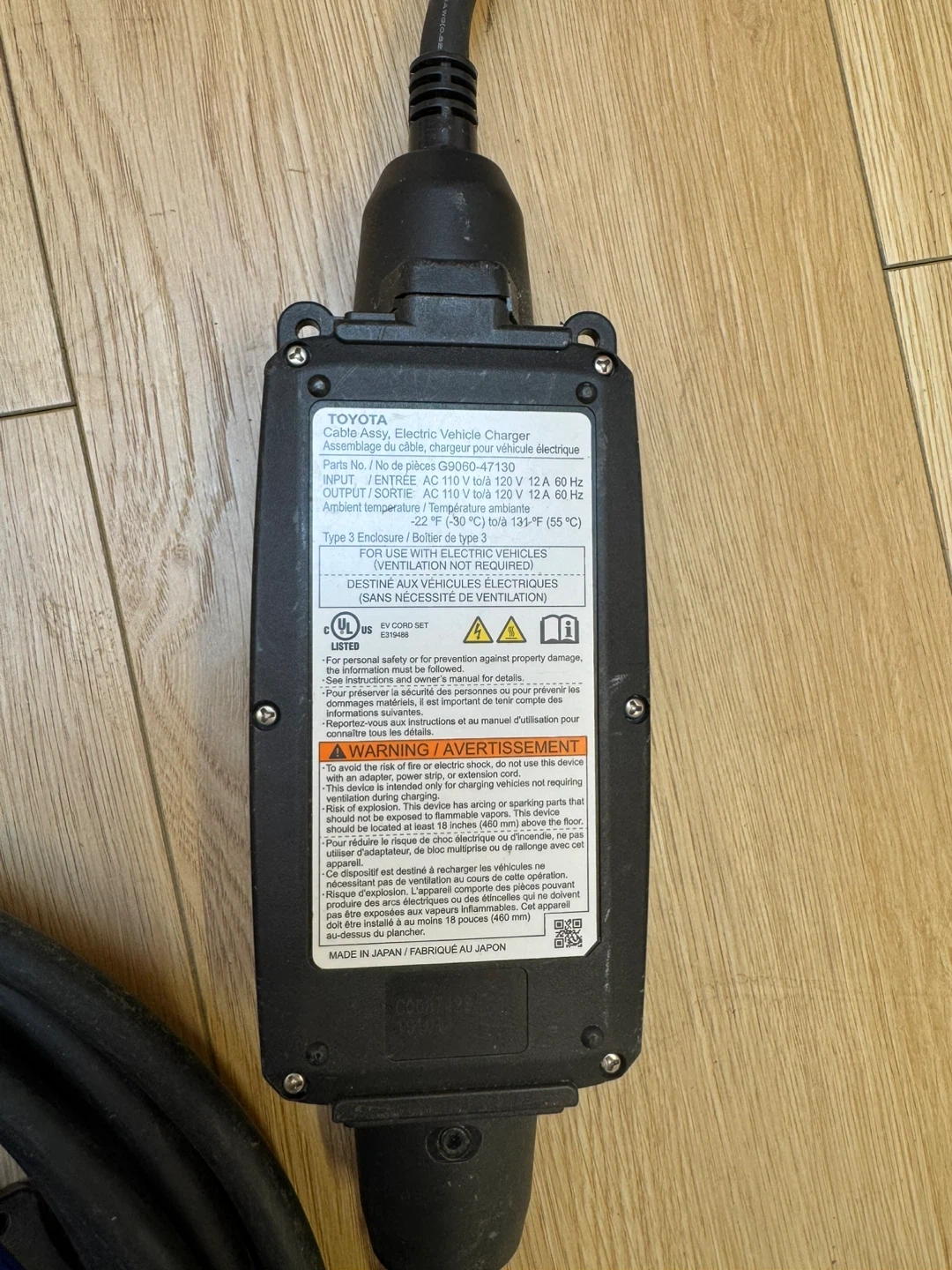 Selling a Toyota Cable Assy Electric Vehicle Charger. It is designed for electric vehicles and comes with a Type 3 Enclosure. It supports AC 110 V/150 V 12 A 60 Hz. Please note the warning and safety information on the device