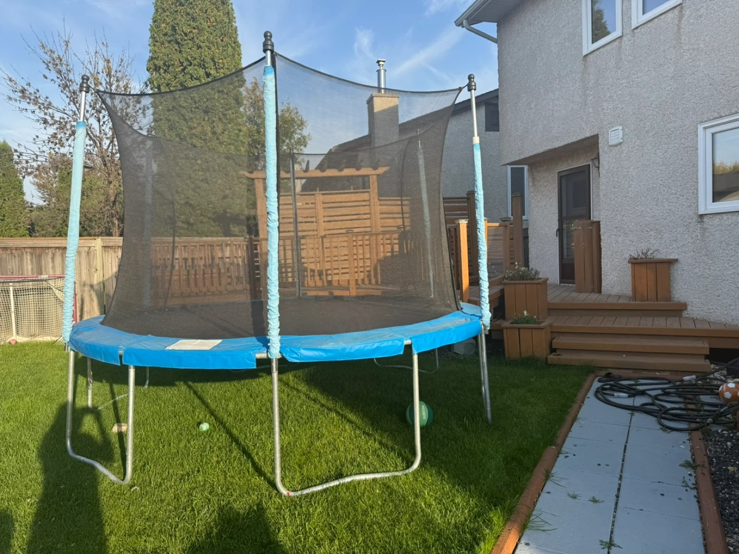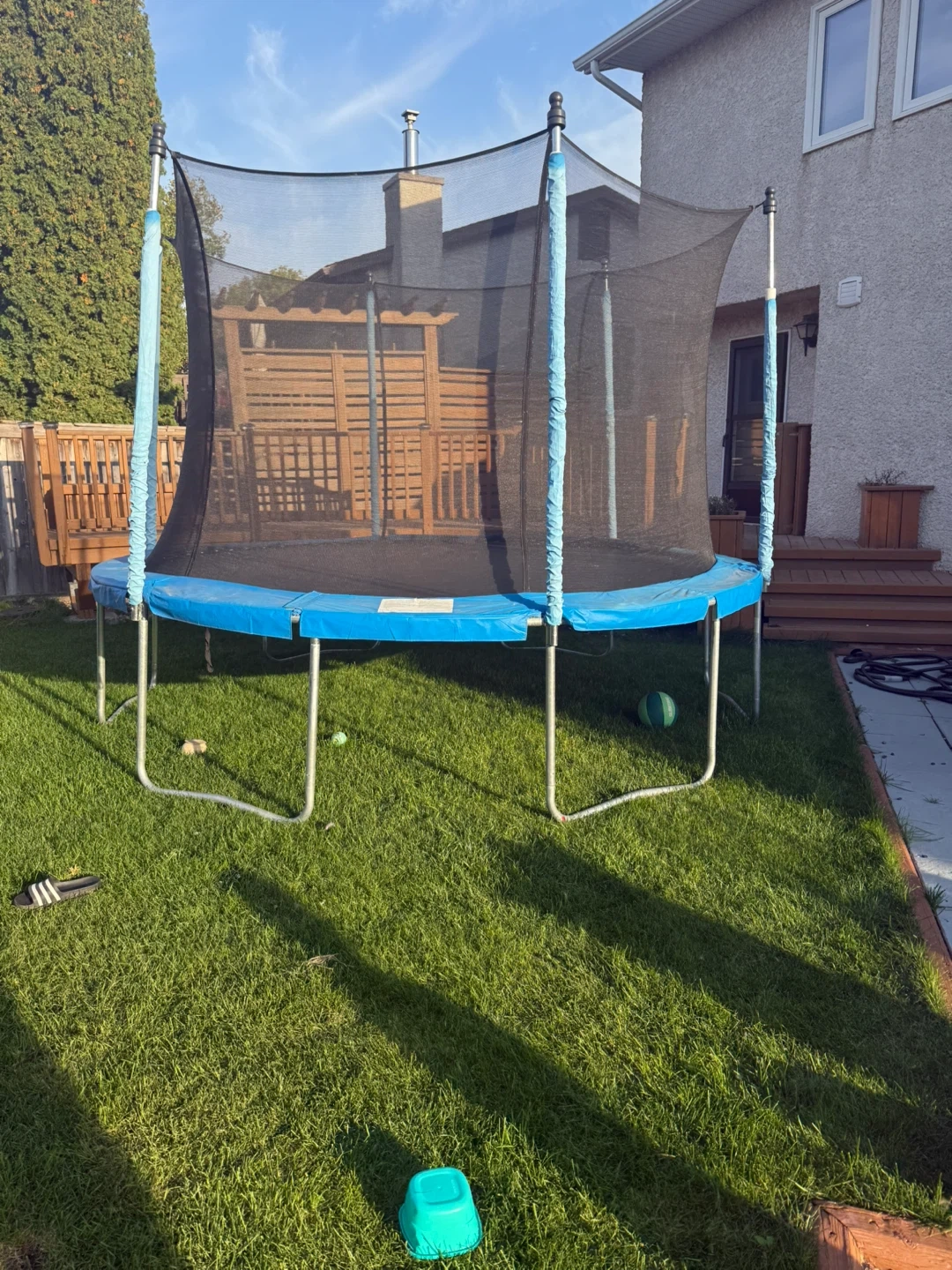 Selling a trampoline with a safety net. It's in good condition and ready for some fun! Perfect for kids to enjoy the outdoors and get some exercise. It's a great addition to any backyard!