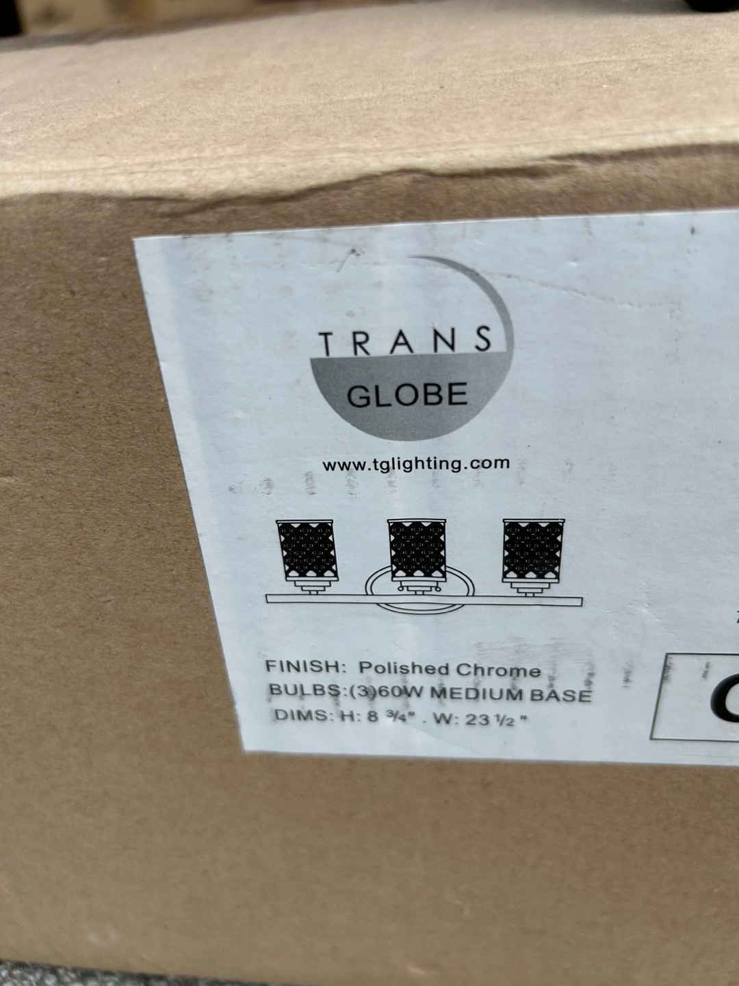 Selling a Trans Globe 3-light vanity light fixture in polished chrome. It's brand new and still in the box! - Finish: Polished Chrome - Bulbs: (3) 60W Medium Base - Dimensions: Height 8 3/4", Width 23 1/2"