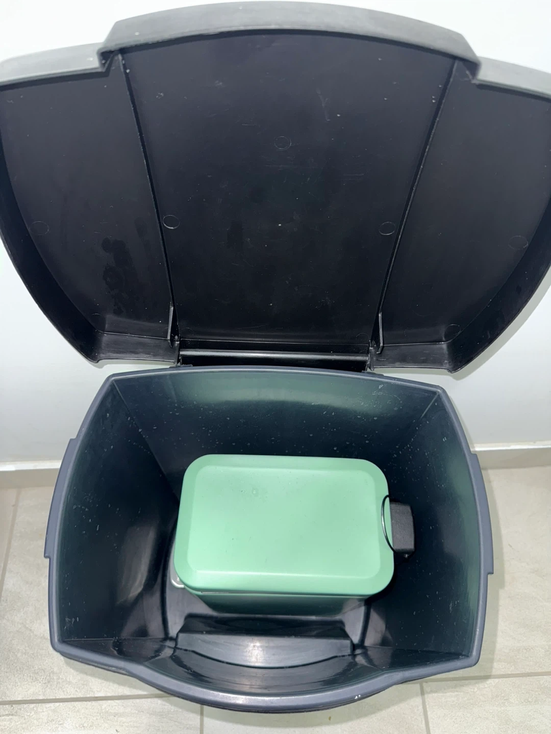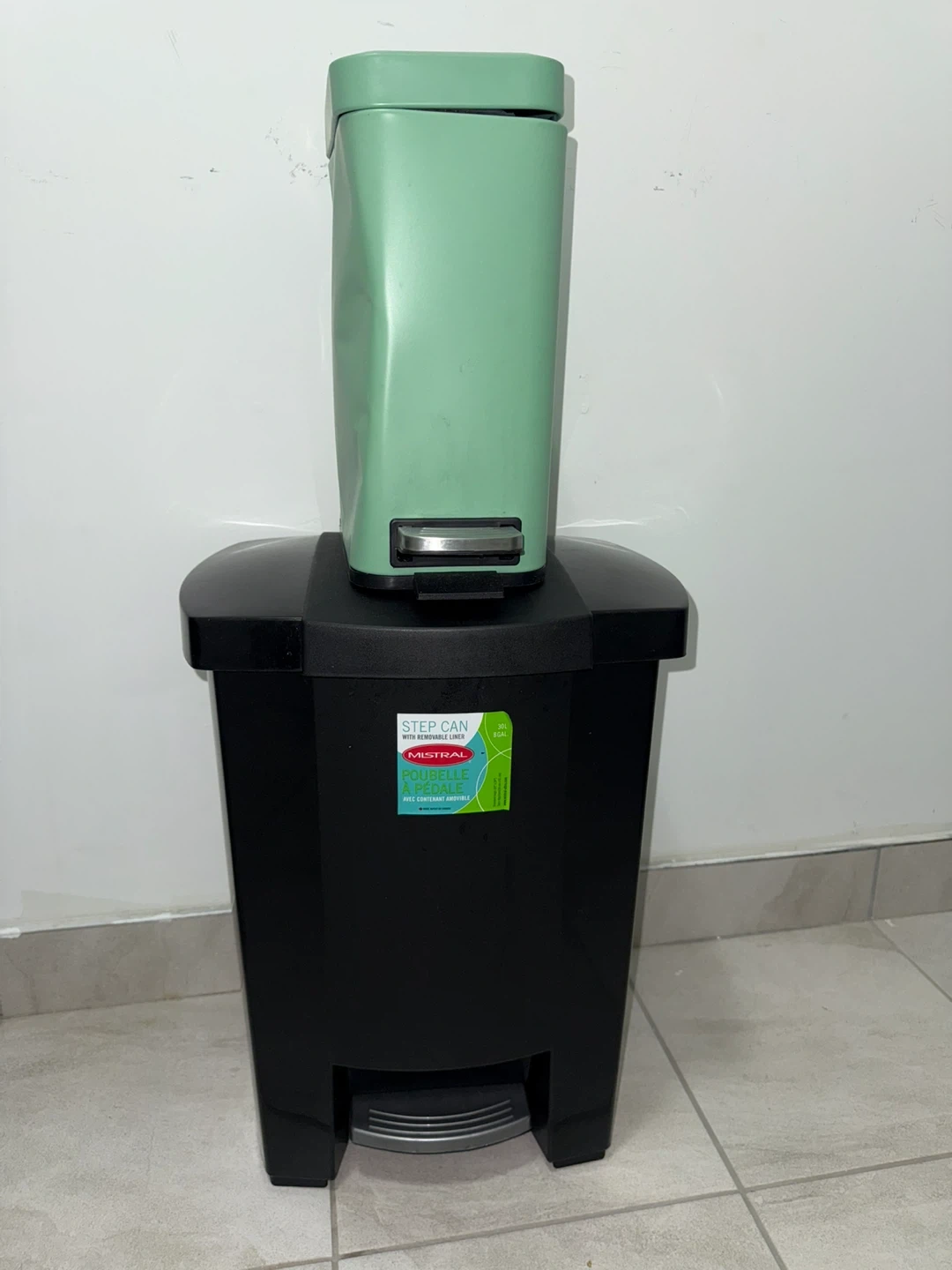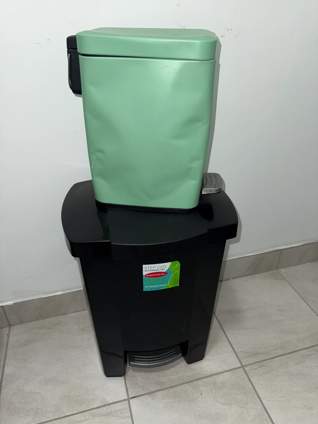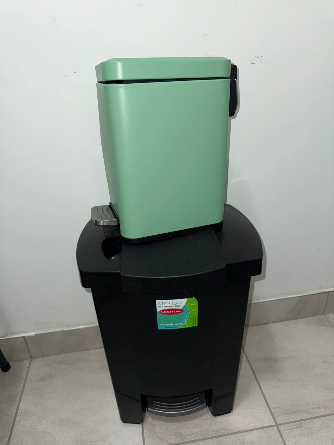 It includes a mint green small step can and a larger black step can. Perfect for organizing your recycling and garbage in style.