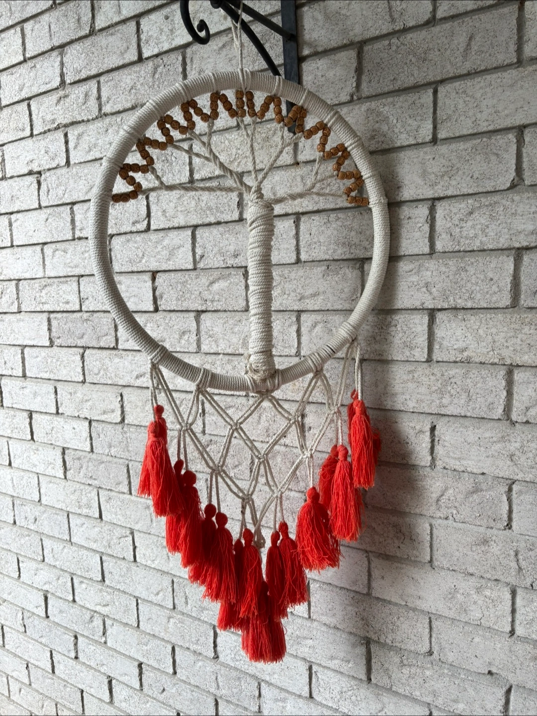 Add a touch of boho charm to your space with this lovely Tree of Life dream catcher! It features a woven design with wooden beads and vibrant red tassels. Perfect for adding a cozy and unique vibe to any room in your home