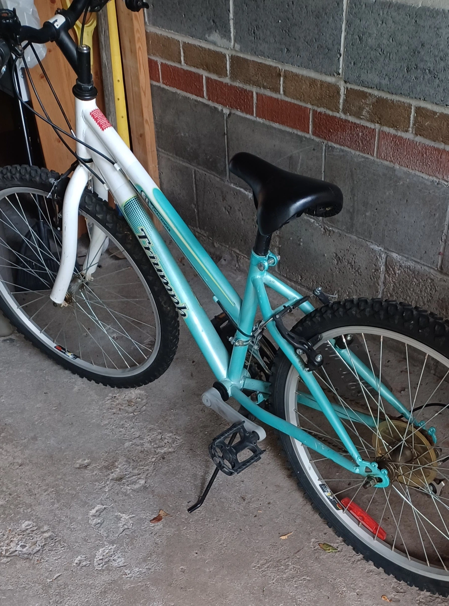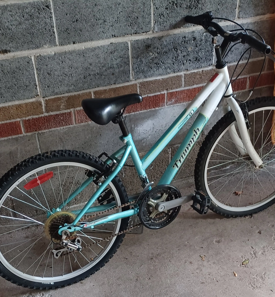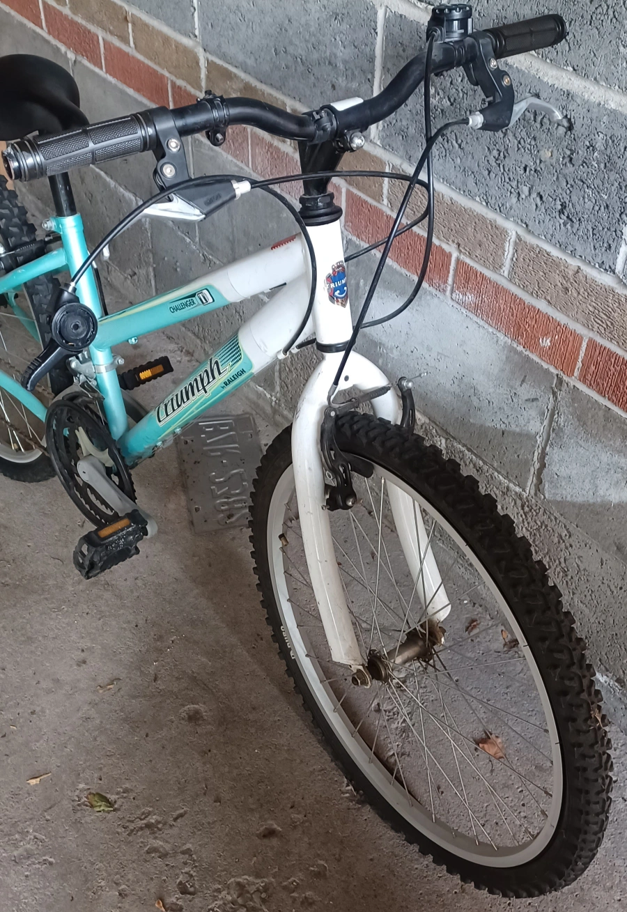 Selling a Triumph Challenger bike in light blue and white. It's in good condition and ready for a new home! Perfect for cruising around the neighbourhood or hitting some trails. Just needs air for wheels.