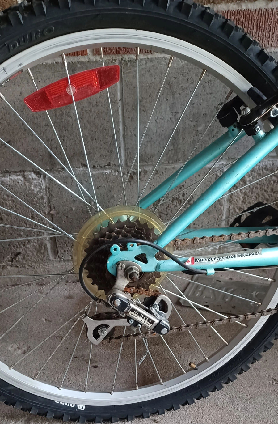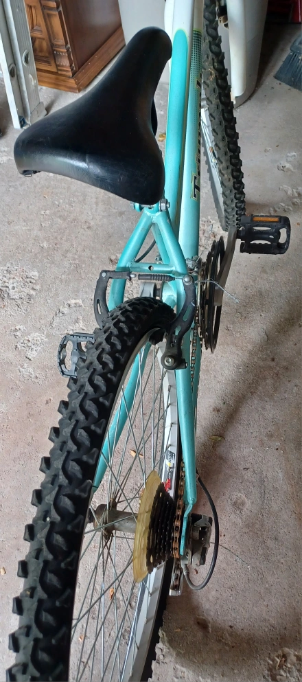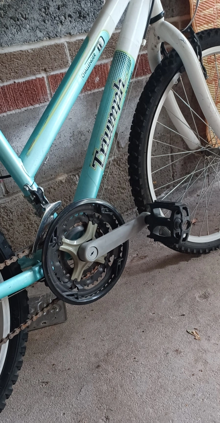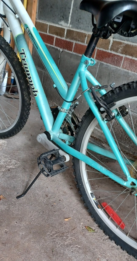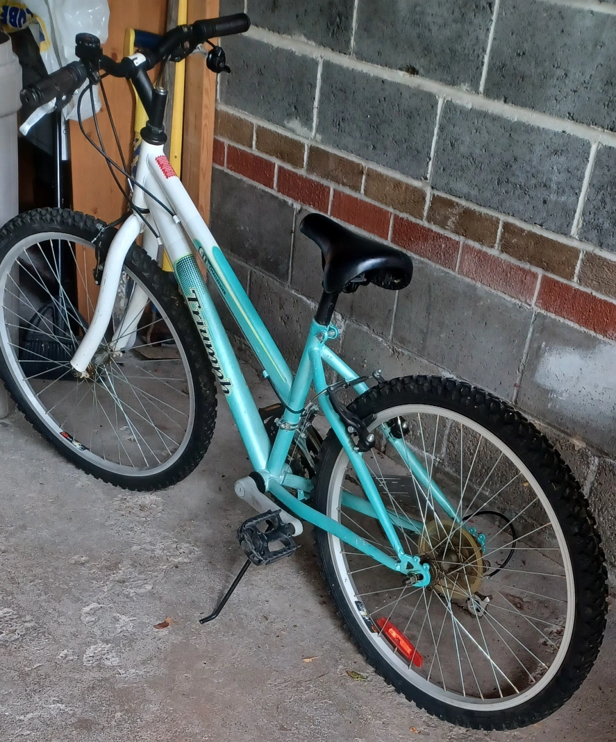 Selling a Triumph Challenger bike in light blue and white. It's in good condition and ready for a new home! Perfect for cruising around the neighbourhood or hitting some trails. Just needs air for wheels.