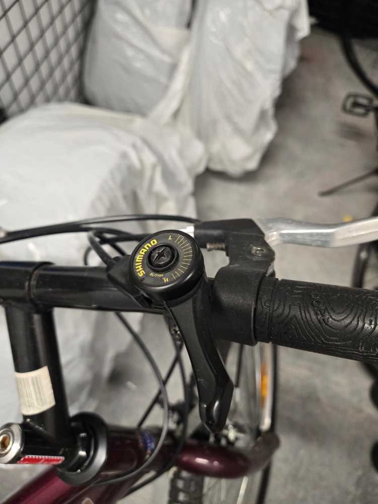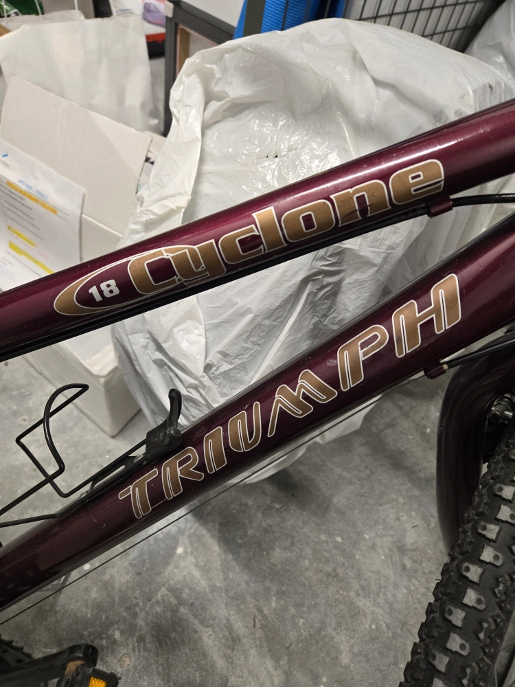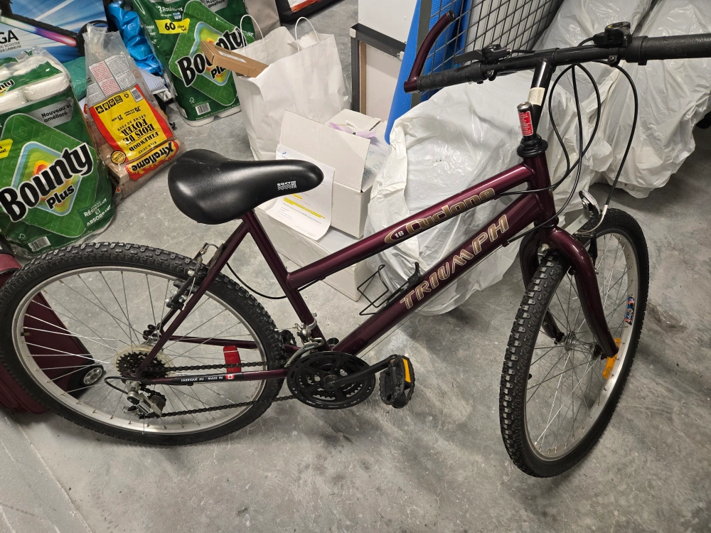 Selling a Triumph Cyclone 18 speed mountain bike in a lovely burgundy colour! It features Shimano components for reliable shifting and braking. Perfect for trails or getting around town