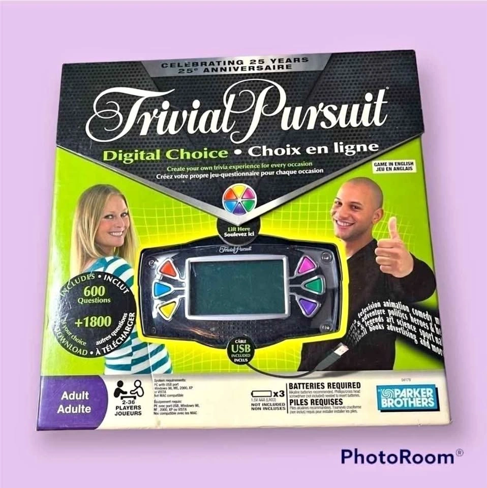 Trivial Pursuit Digital Choice Board Game, never been used! Contains all parts & pieces. Pick & choose categories to create your perfect Trivial Pursuit game! Includes: Electronic unit containing 600 pre-loaded questions, USB Cable, 36 Scoring Wedges, 6 Scoring Tokens, 1 Game Board, 1 Die and Instructions. CASH ONLY. PICK UP IN CAMBRIDGE/KITCHENER