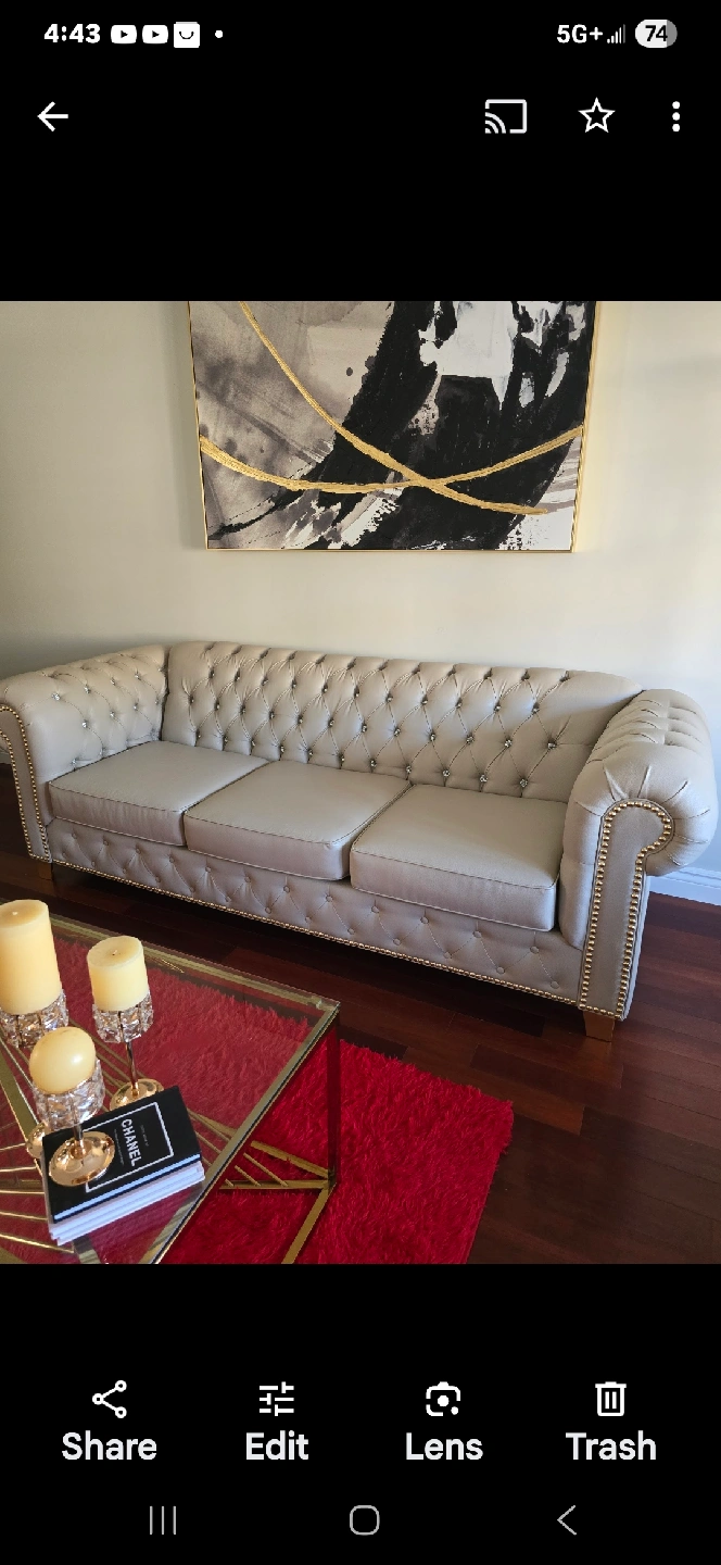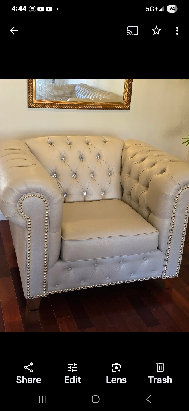 Selling a beautiful tufted leather armchair and matching sofa set. The set is in great condition and would add a touch of elegance to any living room. The leather is soft and supple, and the tufting adds a luxurious feel. Perfect for relaxing or entertaining guests!