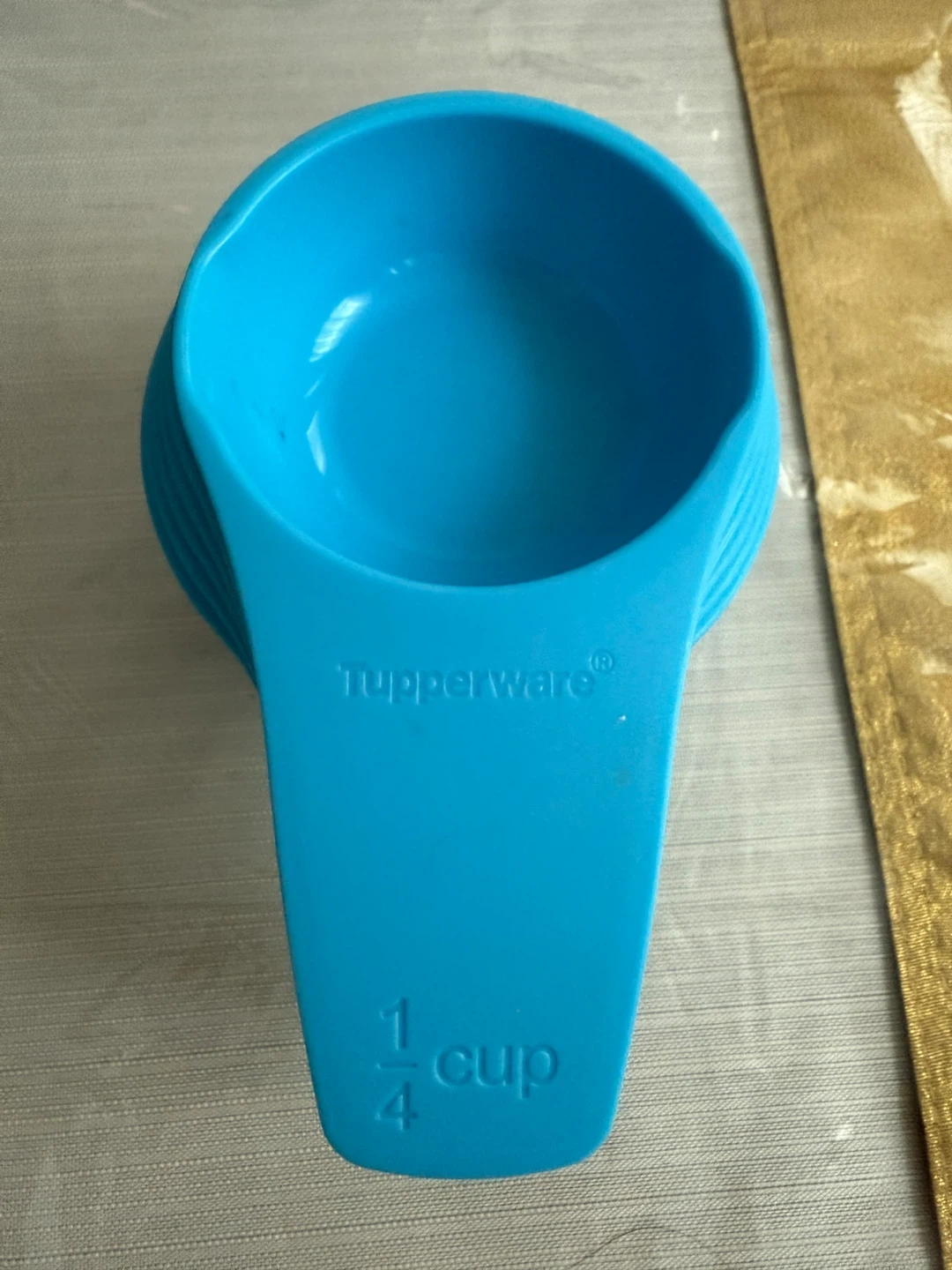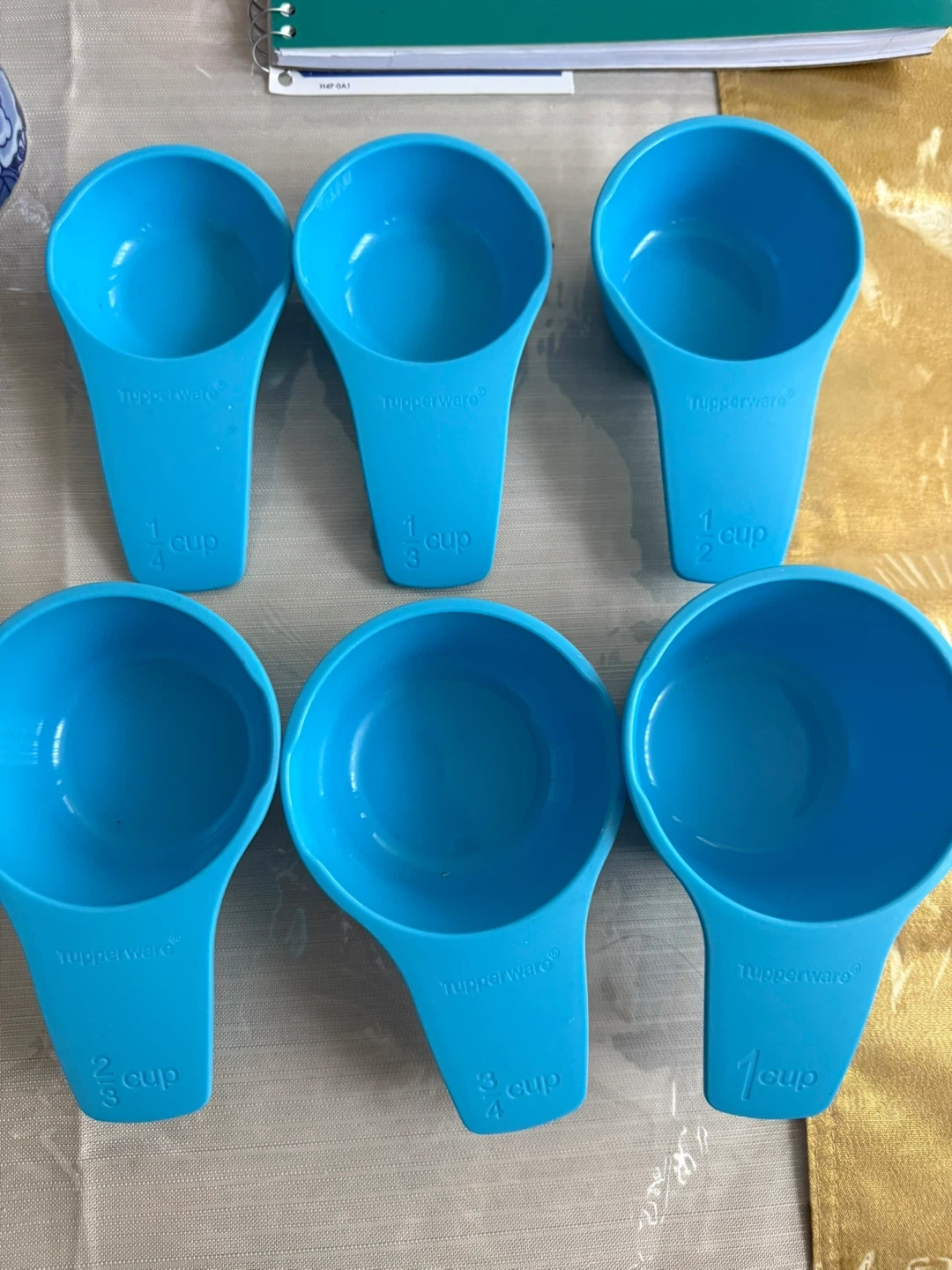 Set of Tupperware measuring cups in a cheerful blue colour! Includes various sizes, from 1/4 cup to 1 cup. Perfect for all your baking and cooking needs