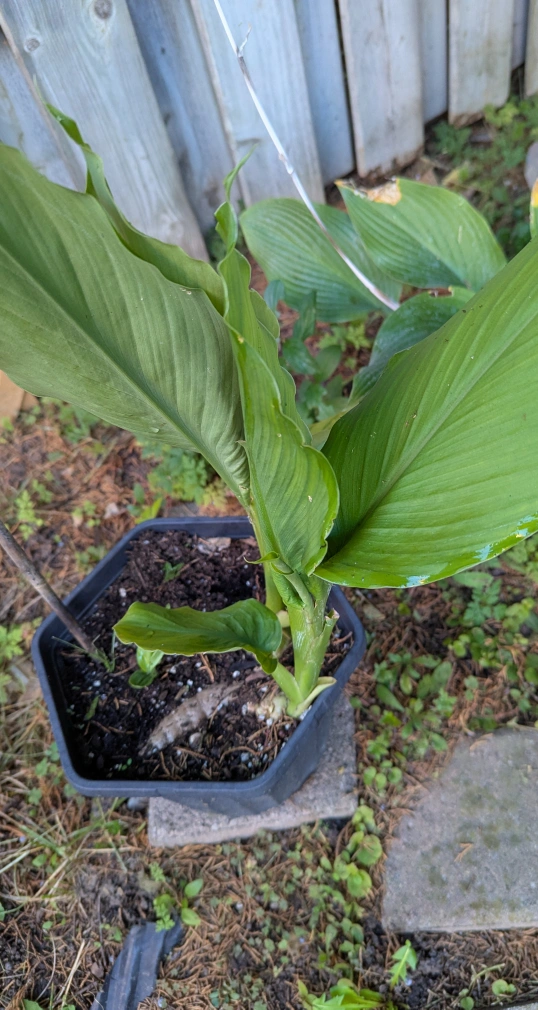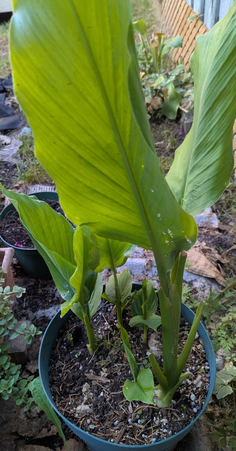 Selling pot of healthy Home grown Organic Turmeric plants potted and full of leaves ! It's a great addition to any garden or indoor space. Enjoy the vibrant green foliage and the potential to harvest your own fresh turmeric root. 2 pots - $30 ( has 3-5 turmeric roots ) 1 pot - $17 ( has 3-5 turmeric roots)