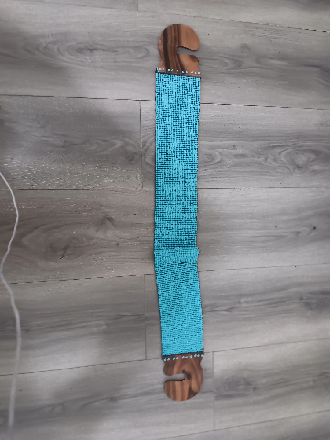 This is a unique turquoise beaded belt featuring wooden accents. It's a stylish piece to add a pop of colour to any outfit!
