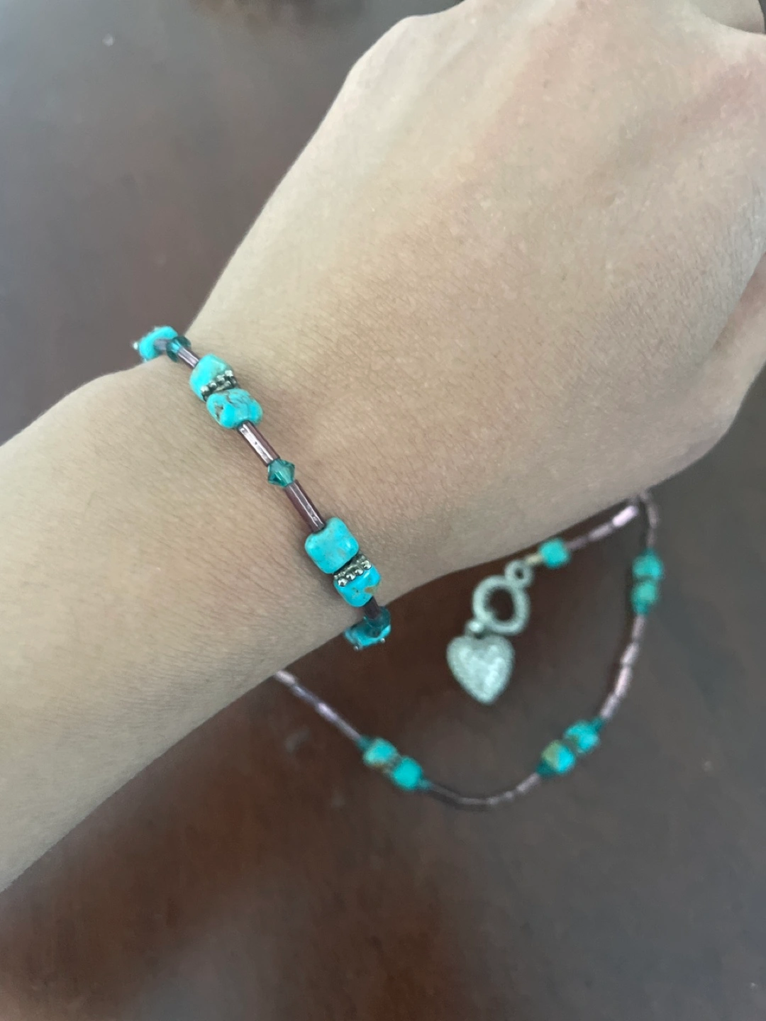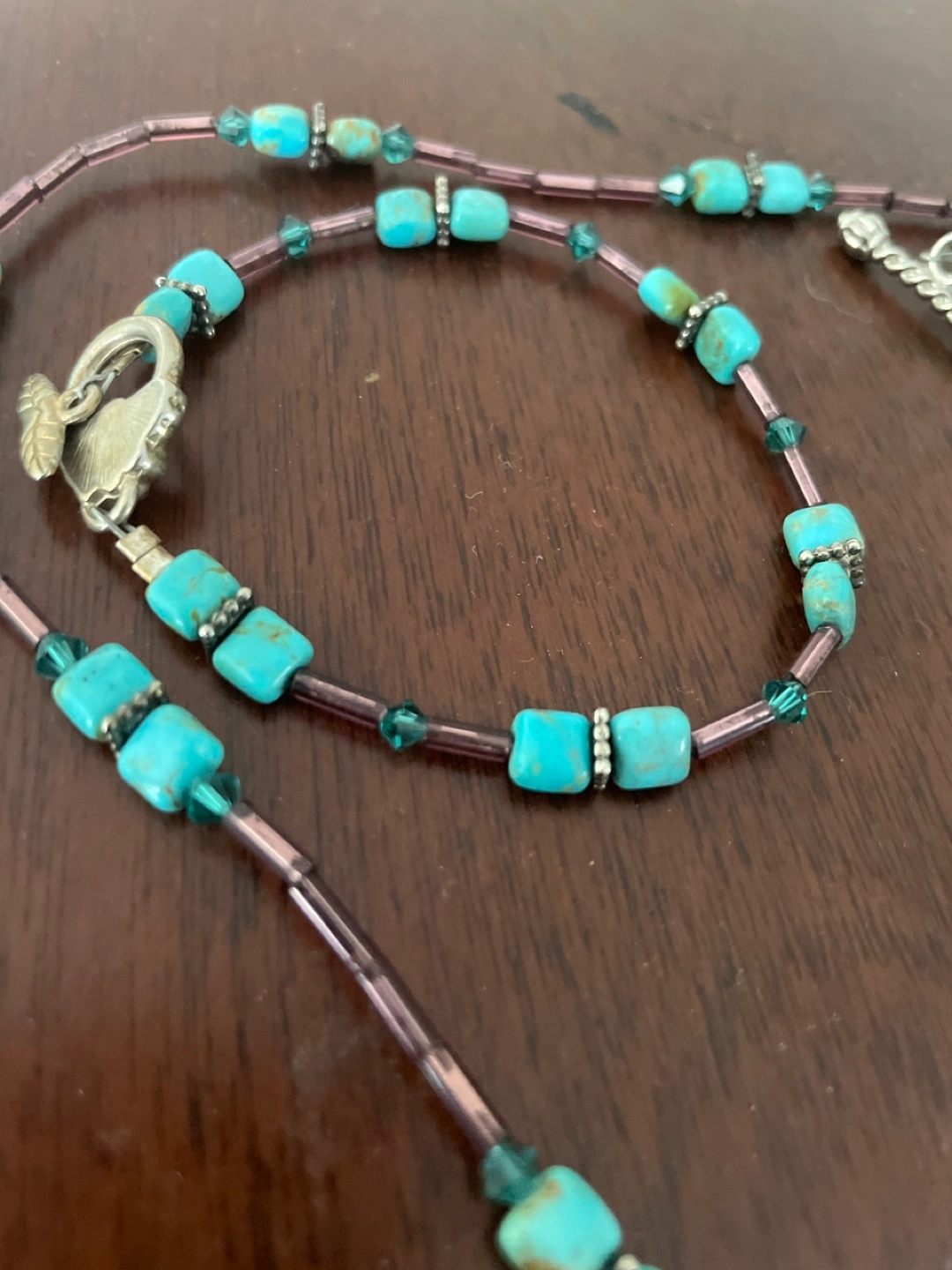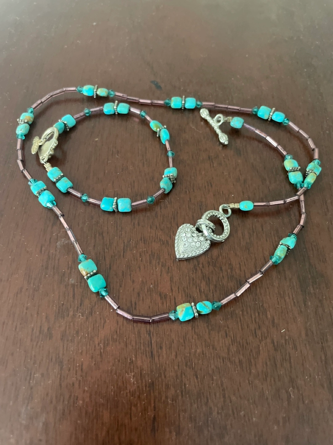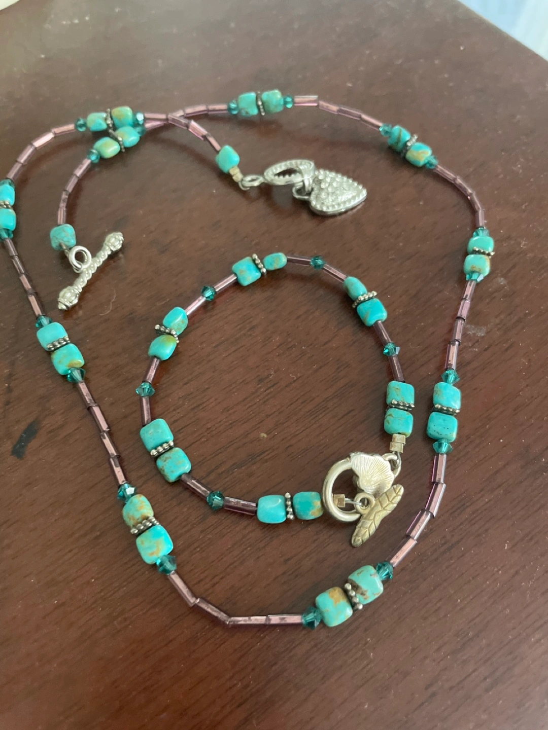 Selling a lovely handmade genuine turquoise beaded necklace and matching bracelet set in silver. The set features turquoise square beads, small purple and teal accent beads, and silver-toned hardware. The necklace has a heart-shaped charm, and both pieces have unique clasps. Perfect for adding a pop of colour to any outfit!