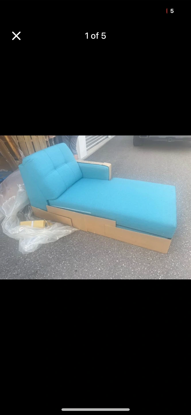 Selling a brand new chaise lounge chair in a lovely turquoise colour! It's still in its packaging, ready to add a pop of colour and relaxation to your space. High end quality from Hudson bay