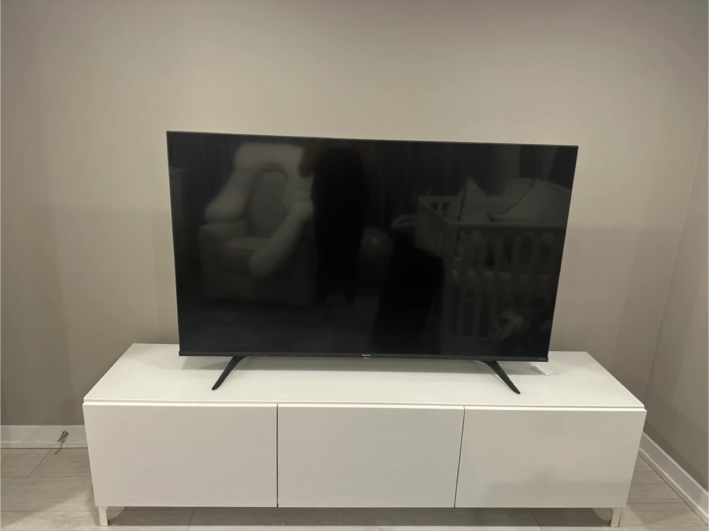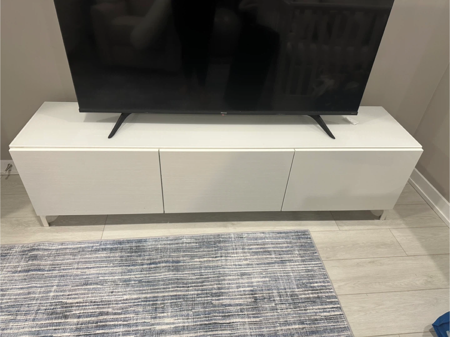 Selling a simple white TV stand! It's in great shape and ready for a new home. Perfect for keeping your entertainment area tidy and stylish White shellac with glass top. Deep drawers hold a lot. H: 20” L: 71” W: 16.5”