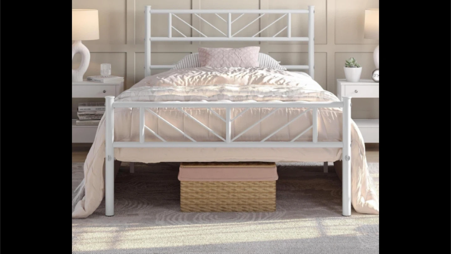 Selling a white metal bed frame. With twin memory foam mattress It's in great condition and ready for a new home! Perfect for adding a touch of simple elegance to your bedroom