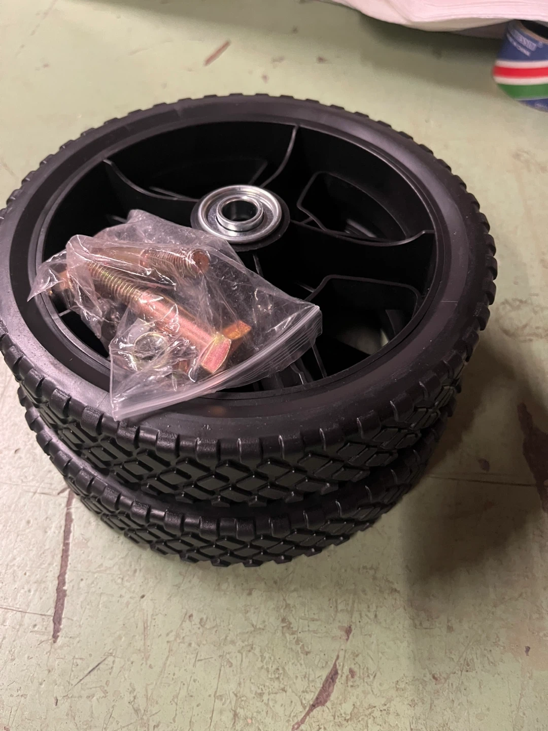 Selling two brand new 8 inch lawn mover black wheels with nuts and bolts