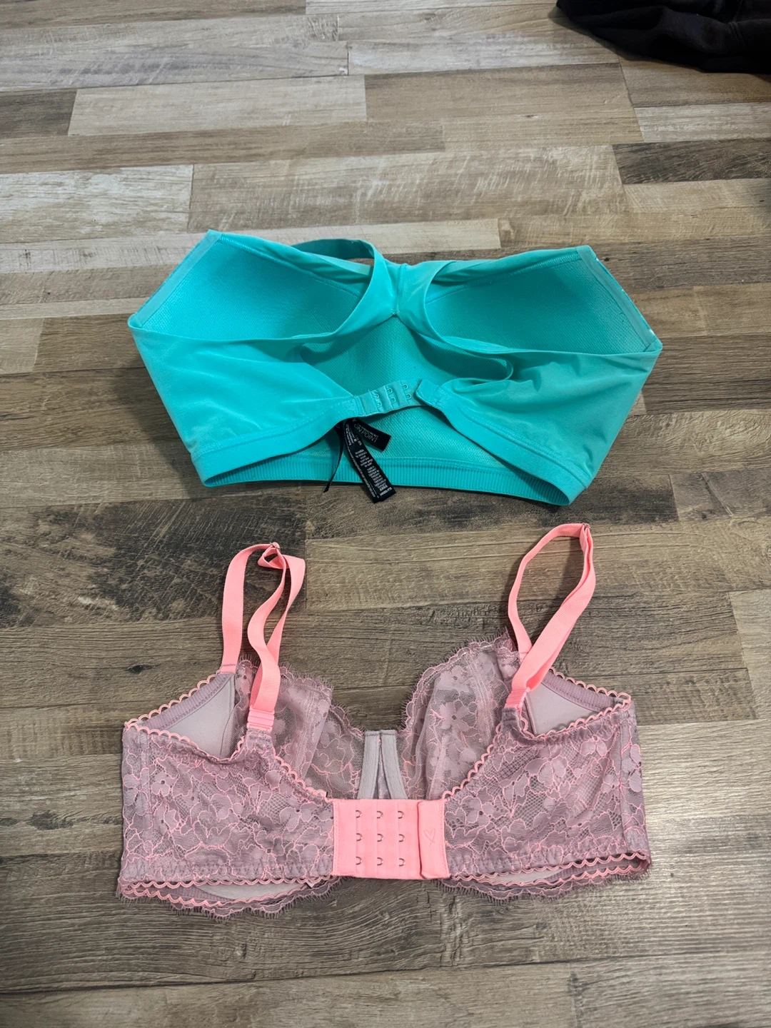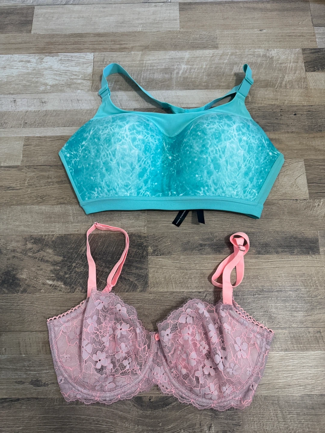 Selling two bras together! One is a turquoise sports bra, perfect for workouts or everyday wear. The other is a pretty pink lace bra with delicate floral detailing. Both are in great condition and ready for a new home both are 34DDD one is 10 both are 15
